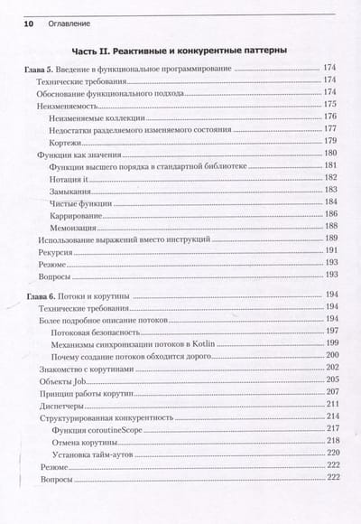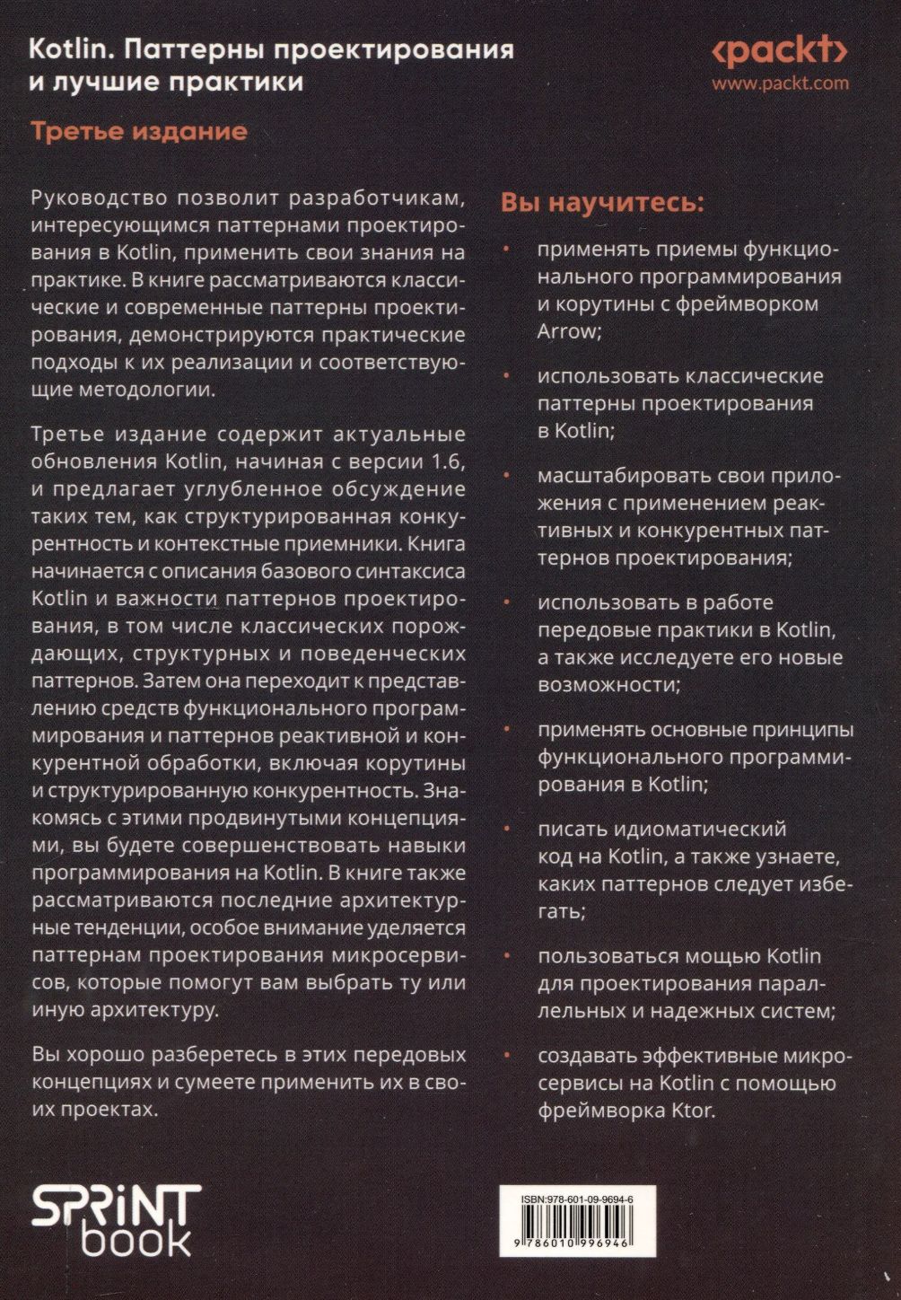 Третье издание содержит актуальные обновления Kotlin, начиная с версии 1.6, и предлагает углубленное обсуждение таких тем, как структурированная конкурентность и контекстные приемники. Книга начинается с описания базового синтаксиса Kotlin и важности паттернов проектирования, в том числе классических порождающих, структурных и поведенческих паттернов. Затем она переходит к представлению средств функционального программирования и паттернов реактивной и конкурентной обработки, включая корутины и структурированную конкурентность. Знакомясь с этими продвинутыми концепциями, вы будете совершенствовать навыки программирования на Kotlin.