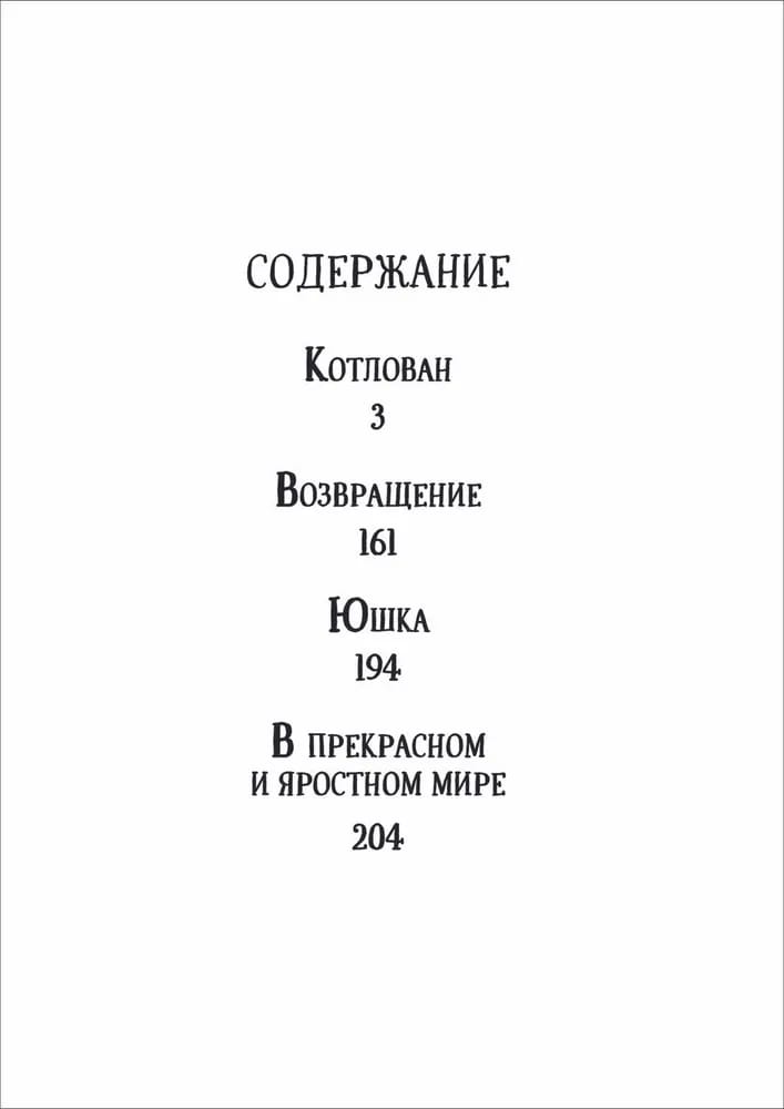 В издание вошли: - «Котлован»; - «Возвращение»; - «Юшка»; - «В прекрасном и яростном мире». Андрей Платонов раскрывает в своих произведениях непростые, но важные для формирования личности темы: столкновение человека с серьезными социальными переменами, к которым невозможно подготовиться заранее. Революция, смена правящего режима, уклада жизни и быта влияет как на общество в целом, так и на каждого человека. Герои писателя по-своему адаптируются, находят свой смысл жизни и учат читателя важным вещам – вечные ценности не зависят от режима. Настоящего человека отличают верность себе, готовность прийти на помощь, неприятие подлости и предательства.