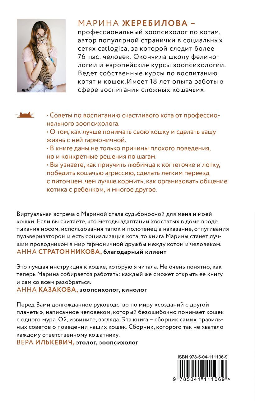 Книга Марины Жеребиловой, профессионального зоопсихолога и фелинолога, создателя популярного блога в Инстаграм о кошках (@catlogica), как раз об этом - как сделать счастливой не только жизнь вашего кота, но и вашу жизнь с ним.