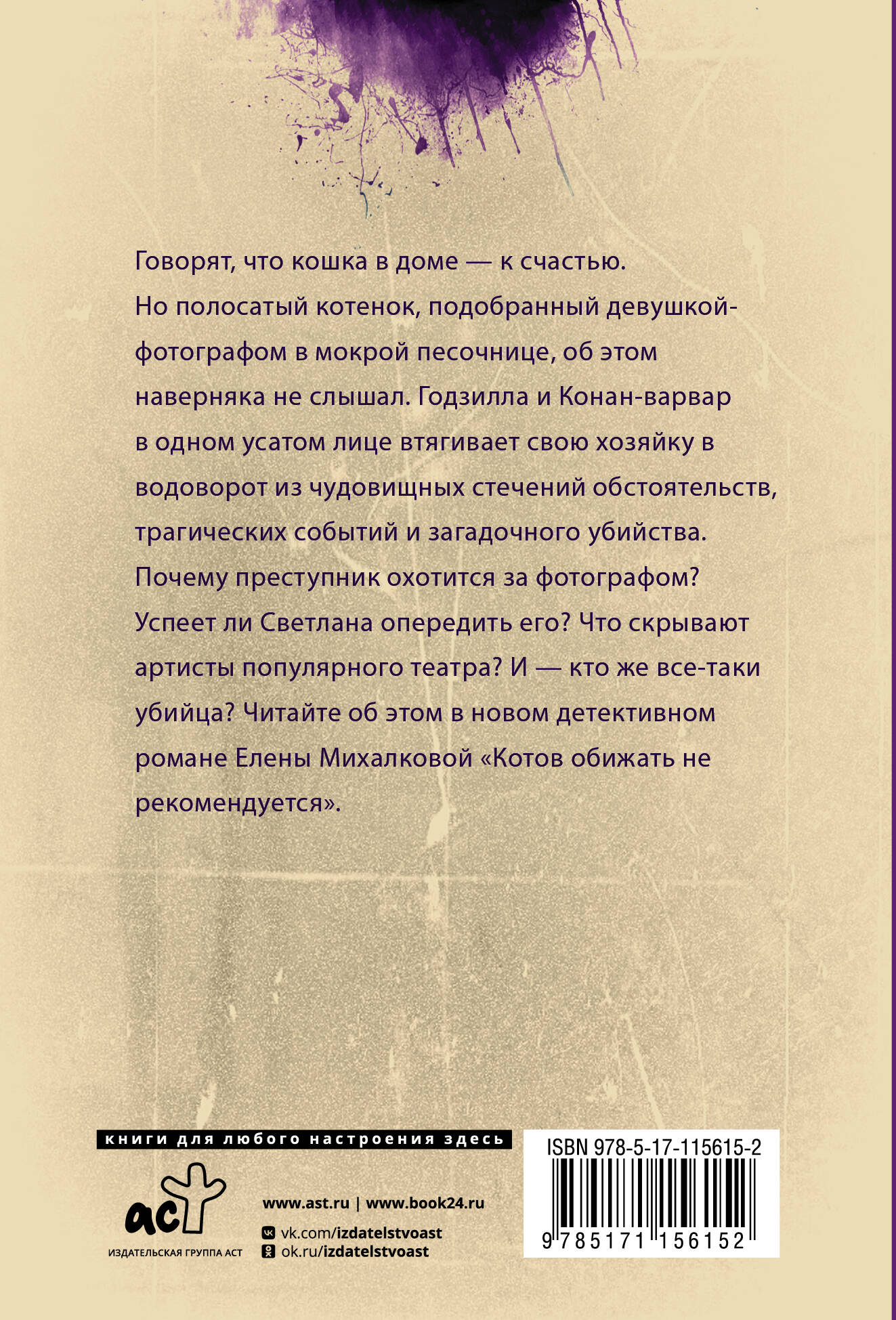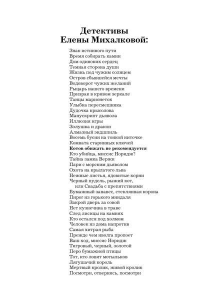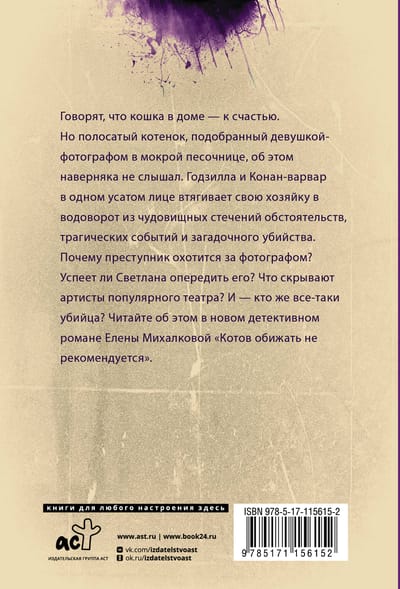 Говорят, что кошка в доме - к счастью. Но полосатый котенок, подобранный девушкой-фотографом в мокрой песочнице, об этом наверняка не слышал. Годзилла и Конан-варвар в одном усатом лице втягивает свою хозяйку в водоворот из чудовищных стечений обстоятельств, трагических событий и загадочного убийства. Почему преступник охотится за фотографом? Успеет ли Светлана опередить его? Что скрывают артисты популярного театра? И - кто же все-таки убийца? Читайте об этом в новом детективном романе Елены Михалковой «Котов обижать не рекомендуется».