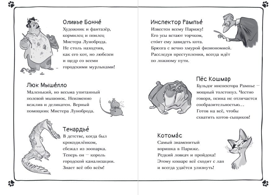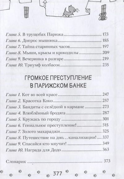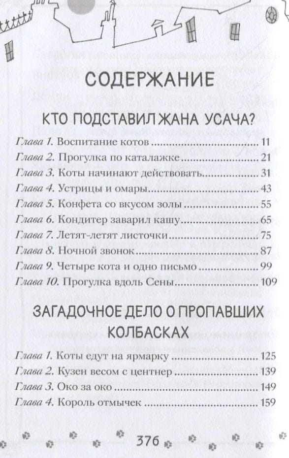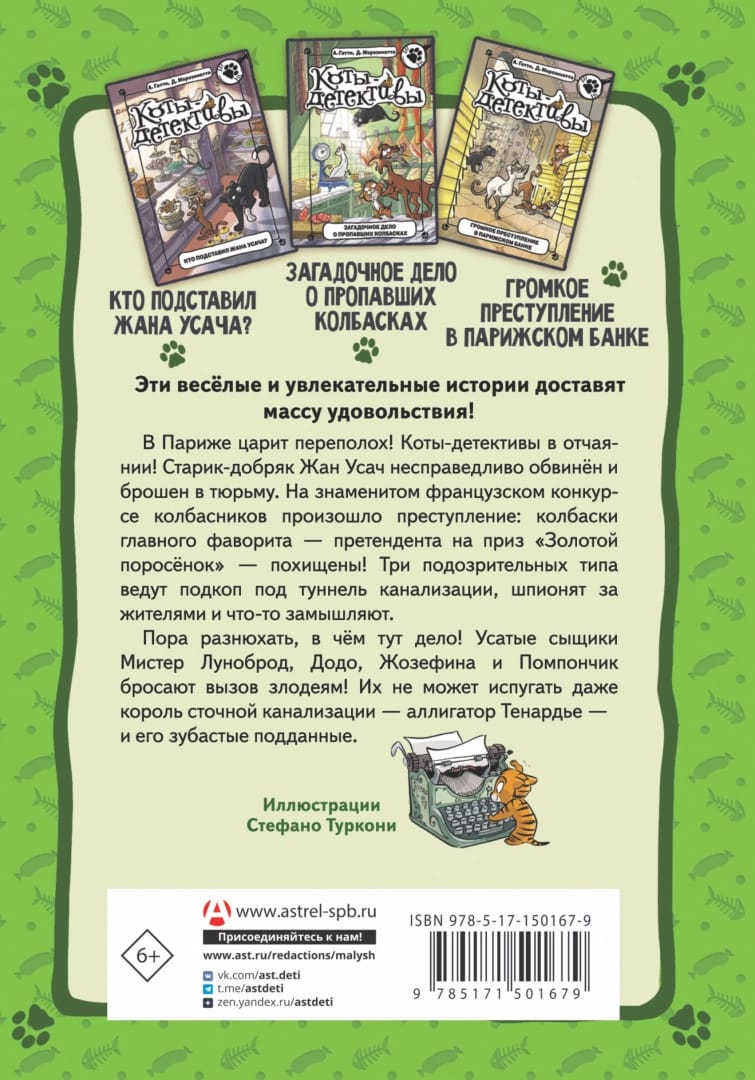 В Париже царит переполох! Коты-детективы в отчаянии! Старик-добряк Жан Усач несправедливо обвинён и брошен в тюрьму. На знаменитом французском конкурсе колбасников произошло преступление: колбаски главного фаворита — претендента на приз «Золотой поросёнок» — похищены! Три подозрительных типа ведут подкоп под туннель канализации, шпионят за жителями и что-то замышляют. Пора разнюхать, в чём тут дело! Усатые сыщики Мистер Луноброд, Додо, Жозефина и Помпончик бросают вызов злодеям! Их не может испугать даже король сточной канализации — аллигатор Тенардье — и его зубастые подданные. Подарочное издание сразу трех невероятных историй о котах-детективах.