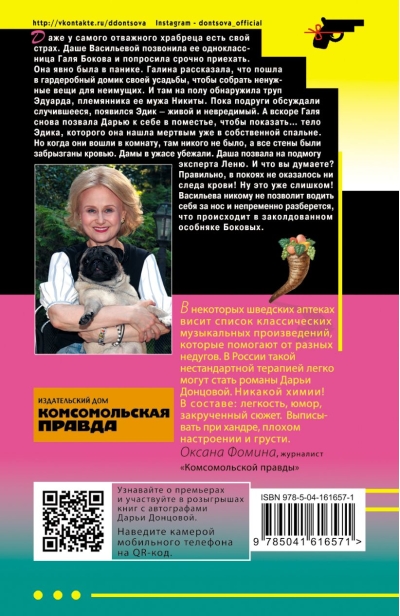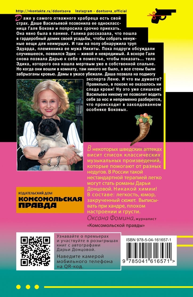 Даже у самого отважного храбреца есть свой страх. Даше Васильевой позвонила ее одноклассница Галя Бокова и попросила срочно приехать. Она явно была в панике. Галина рассказала, что пошла в гардеробный домик своей усадьбы, чтобы собрать ненужные вещи для неимущих. И там на полу обнаружила труп Эдуарда, племянника ее мужа Никиты. Пока подруги обсуждали случившееся, появился Эдик - живой и невредимый. А вскоре Галя снова позвала Дарью к себе в поместье, чтобы показать… тело Эдика, которого она нашла мертвым уже в собственной спальне. Но когда они вошли в комнату, там никого не было, а все стены были забрызганы кровью. Дамы в ужасе убежали. Даша позвала на подмогу эксперта Леню. И что вы думаете? Правильно, в покоях не оказалось ни следа крови! Ну это уже слишком! Васильева никому не позволит водить себя за нос, и непременно разберется что происходит в заколдованном особняке Боковых.