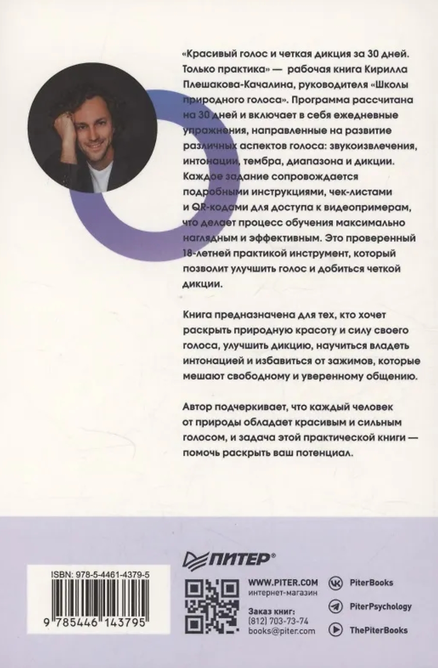 «Красивый голос и четкая дикция за 30 дней. Только практика» — практическая книга Кирилла Плешакова-Качалина, руководителя «Школы природного голоса». Это проверенный практикой инструмент, который позволить улучшить голос и добиться четкой дикции. Программа рассчитана на 30 дней и включает в себя ежедневные упражнения, направленные на развитие различных аспектов голоса: звукоизвлечение, интонация, тембр, диапазон и дикция. Каждое задание сопровождается подробными инструкциями, чек-листами и QR-кодами для доступа к видеопримерам, что делает процесс обучения максимально наглядным и эффективным.