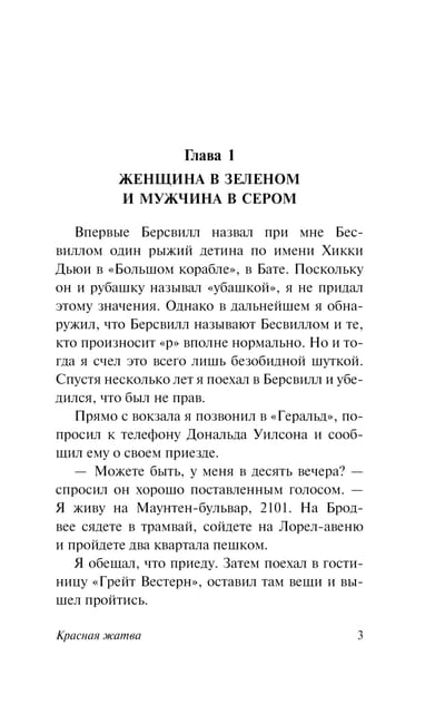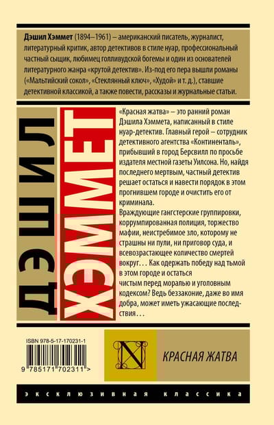 «Красная жатва» — это ранний роман Дэшила Хэммета, написанный в стиле нуар-детектив. Главный герой — сотрудник детективного агентства «Континенталь», прибывший в город Берсвилл по просьбе издателя местной газеты Уилсона. Но, найдя последнего мертвым, частный детектив решает остаться и навести порядок в этом прогнившем городе и очистить его от криминала.