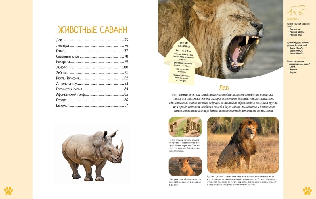 Эта книга позволит тебе совершить увлекательное путешествие по миру. В высоких горах ты встретишься с ламами и горными баранами, в бескрайних знойных пустынях тебя поджидают скорпионы и верблюды, в покрытых льдами Арктике и Антарктике - пингвины и белые медведи, в морских и океанских глубинах ты увидишь дельфинов и скатов, а в саваннах - львов и слонов.