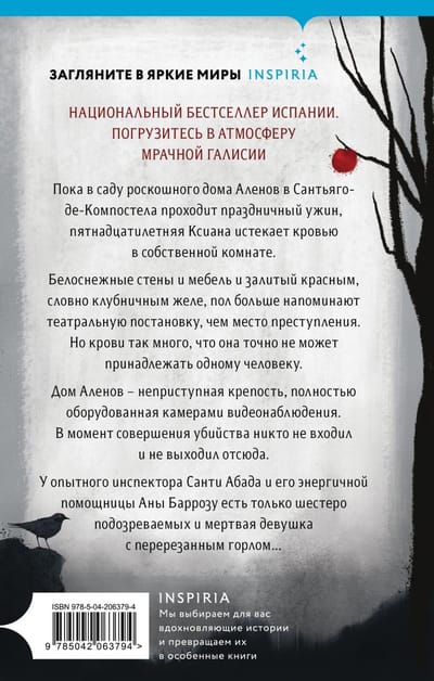 Пока в саду роскошного дома Аленов в Сантьяго-де-Компостела проходит праздничный ужин, пятнадцатилетняя Ксиана истекает кровью в собственной комнате. Белоснежные стены и мебель и залитый красным, словно клубничным желе, пол больше напоминают театральную постановку, чем место преступления. Но крови так много, что она точно не может принадлежать одному человеку.