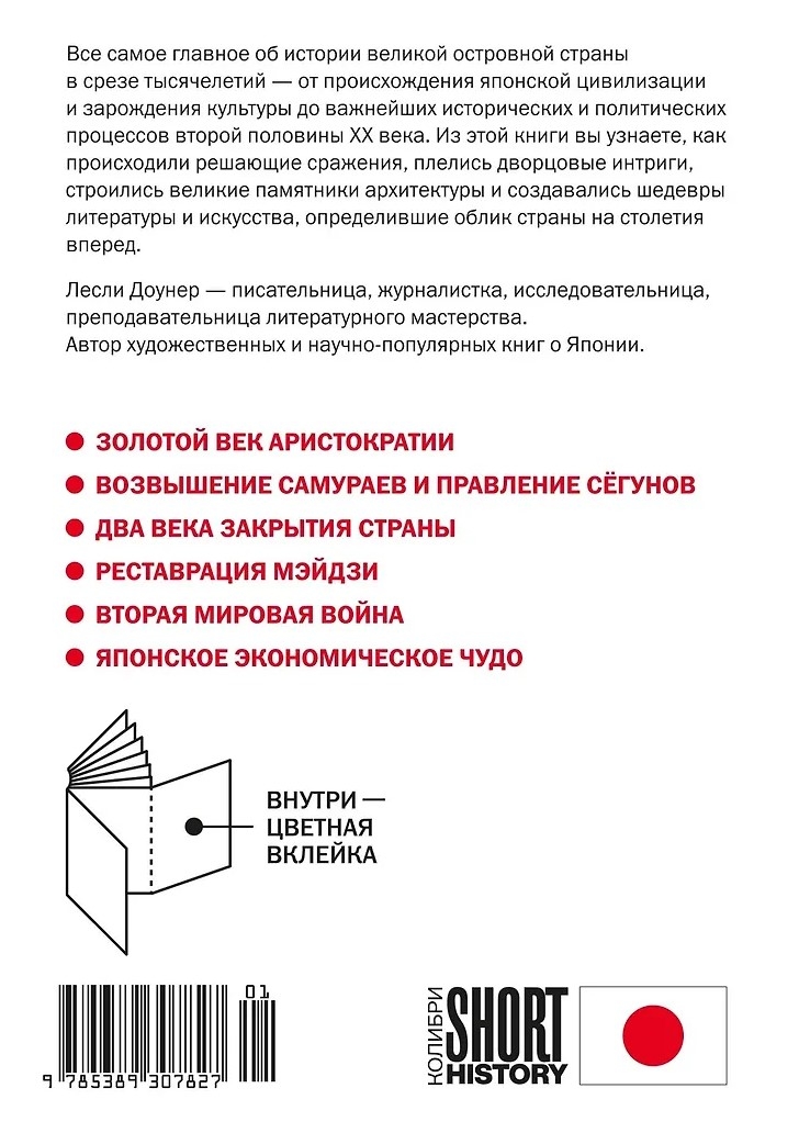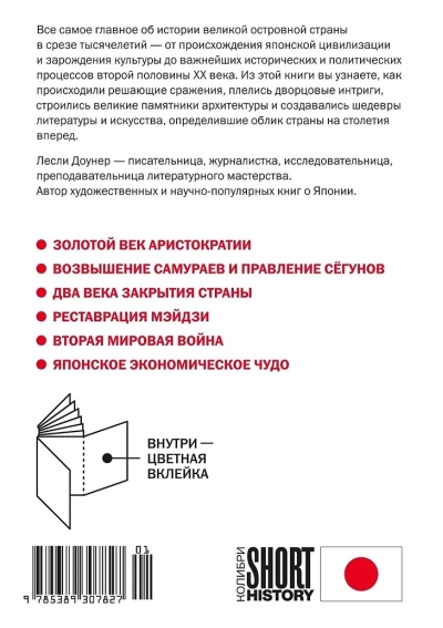 Страна многих тысяч островов, Япония долгое время была загадкой для европейцев и даже сейчас продолжает будоражить умы людей по всему миру. Лесли Доунер, эксперт по японской культуре, рассказывает, как это удивительное государство переживало периоды изоляции и насильственного открытия, воинственного феодализма и мирного процветания, разрушительных поражений и феноменального возрождения. «Краткая история Японии» — это захватывающее исследование духа нации, которая сумела выработать неповторимый характер и культуру, пройдя через колоссальные исторические вызовы.