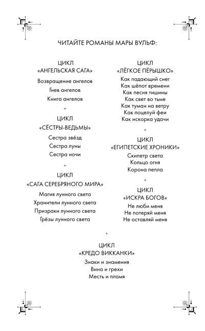 Любовь и ненависть. Тайны старинных викканских гримуаров. Загадочное прошлое. Знаки судьбы и предсказания рун. Серия — настоящая головоломка, написанная потрясающим слогом знаменитой Мары Вульф! Для всех поклонников мистического фэнтези. Более 16 тыс. отзывов на Амазон на серию! Первый том цикла — бестселлер по версии немецкого журнала «Spiegel».