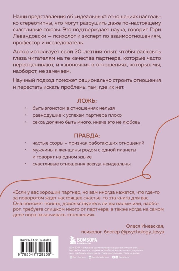 Наши представления об «идеальных» отношениях настолько стереотипны, что могут разрушить даже по-настоящему счастливые союзы. Это подтверждает наука, говорит Гэри Левандовски — психолог и эксперт по взаимоотношениям, профессор и исследователь. Автор использует свой 20-летний опыт, чтобы раскрыть глаза читателей на те качества партнера, которые часто переоценивают, и «звоночки» в отношениях, которых мы, наоборот, не замечаем.
