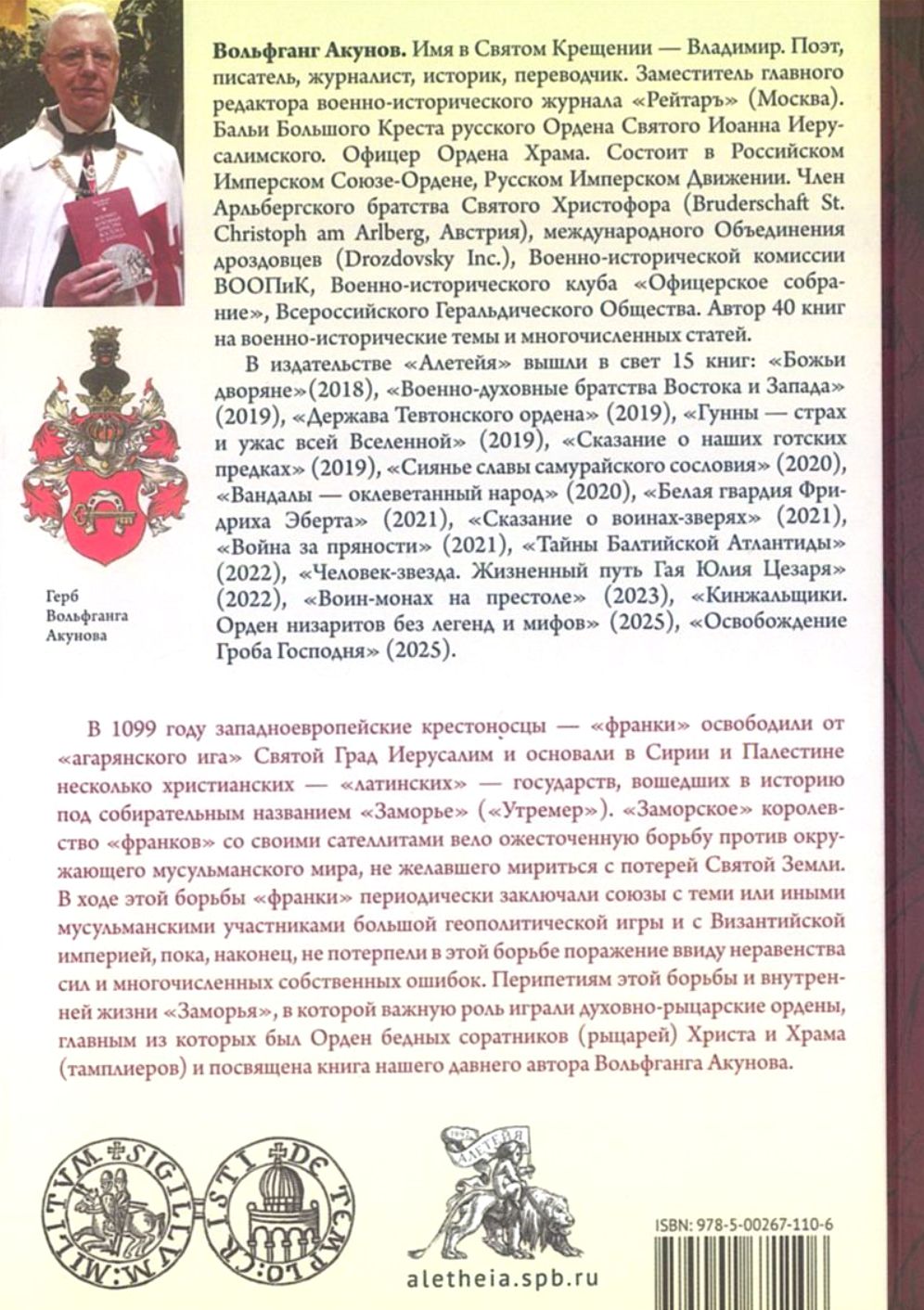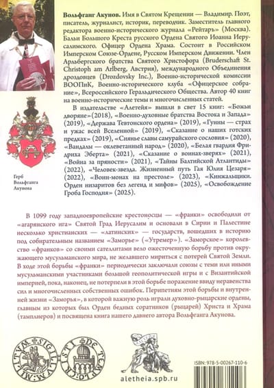 В 1099 году западноевропейские крестоносцы — «франки» освободили от «агарянского ига» Святой Град Иерусалим и основали в Сирии и Палестине несколько христианских — «латинских» — государств, вошедших в историю под собирательным названием «Заморье» («Утремер»). «Заморское» королевство «франков» со своими сателлитами вело ожесточенную борьбу против окружающего мусульманского мира, не желавшего мириться с потерей Святой Земли. В ходе этой борьбы «франки» периодически заключали союзы с теми или иными мусульманскими участниками большой геополитической игры и с Византийской империей, пока, наконец, не потерпели в этой борьбе поражение ввиду неравенства сил и многочисленных собственных ошибок. Перипетиям этой борьбы и внутренней жизни «Заморья», в которой важную роль играли духовно-рыцарские ордены, главным из которых был Орден бедных соратников (рыцарей) Христа и Храма (тамплиеров), и посвящена книга нашего давнего автора Вольфганга Акунова.