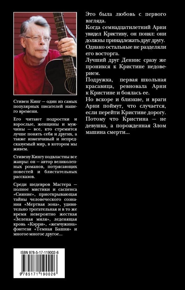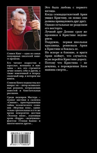 Это была любовь с первого взгляда. Когда семнадцатилетний Арни увидел Кристину, он понял: они должны принадлежать друг другу. Однако остальные не разделяли его восторга. Лучший друг Деннис сразу же проникся к Кристине недоверием. Подружка, первая школьная красавица, ревновала Арни к Кристине и боялась ее. Но вскоре и близкие, и враги Арни поймут, что случается, если перейти Кристине дорогу. Потому что Кристина - не девушка, а порожденная Злом машина смерти… Читайте роман Стивена Кинга "Кристина" в новом переводе!
