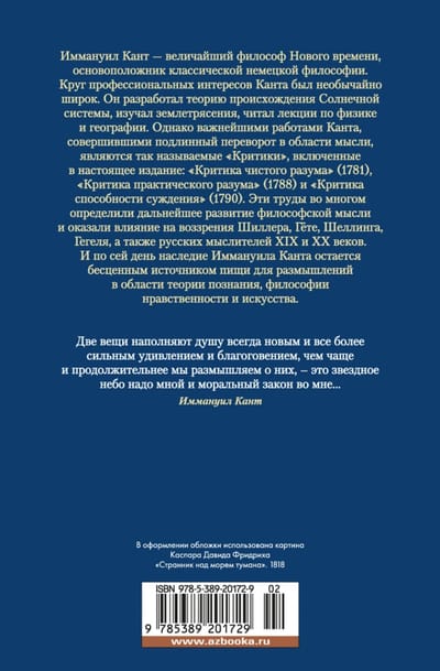 Иммануил Кант — величайший из философов Нового времени, основоположник классической немецкой философии. Круг профессиональных интересов Канта был необычайно широк. Он разработал теорию происхождения солнечной системы, изучал землетрясения, читал лекции по физике и географии. Однако важнейшими работами Канта, совершившими подлинный переворот в области мысли, являются так называемые «Критики», включенные в настоящее издание: «Критика чистого разума» (1781), «Критика практического разума» (1788) и «Критика способности суждения» (1790). Эти труды во многом определили дальнейшее развитие философской мысли и оказали влияние на воззрения Шиллера, Гёте, Шеллинга, Гегеля, а также русских мыслителей XIX и XX веков; и по сей день наследие Иммануила Канта остается бесценным источником пищи для размышлений в области теории познания, философии нравственности и искусства.