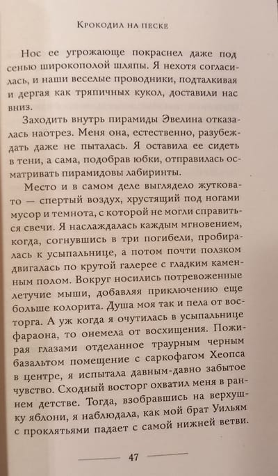 По дороге Амелия обзаводится подругой, и вместе они с головой погружаются в мир опасностей. Жизнь в древней гробнице, охота на ожившую мумию, поиски древних сокровищ и язвительные перепалки с назойливым археологом, решительно презирающим женщин, доставляют Амелии огромное наслаждение.