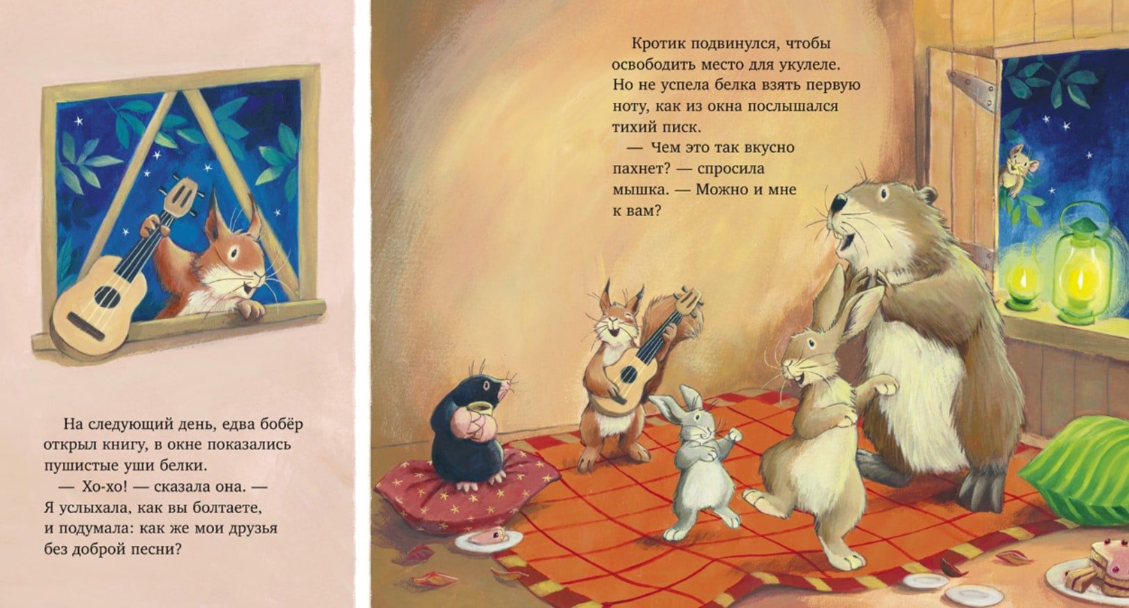 В уютном домике на дереве, где живут бобер и кротик, всегда полно гостей и много шуток! То заяц прискачет на тортик, то ежики забегут погреться. Хорошо, что в домике столько места!