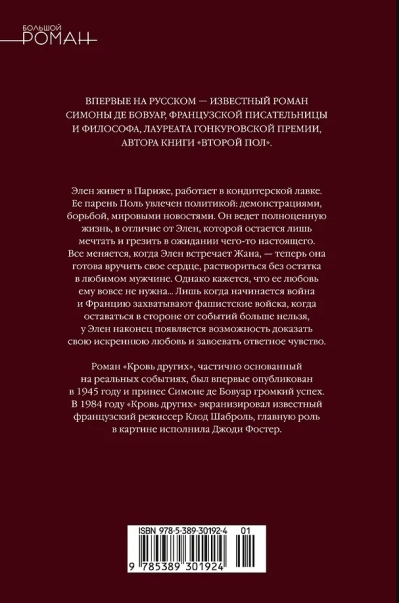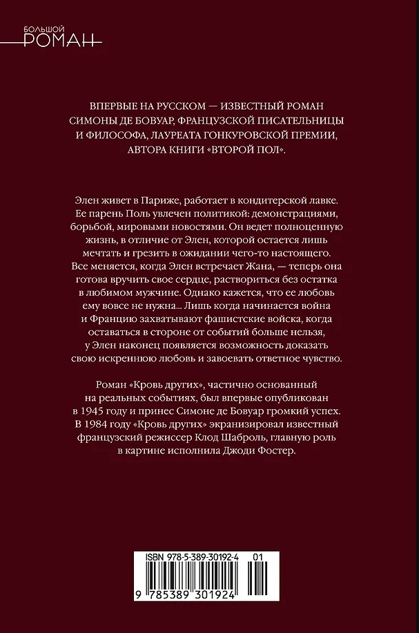 Роман «Кровь других», частично основанный на реальных событиях, был впервые опубликован в 1945 году и принес Симоне де Бовуар громкий успех. В 1984 году «Кровь других» экранизировал известный французский режиссер Клод Шаброль, главную роль в картине исполнила Джоди Фостер.