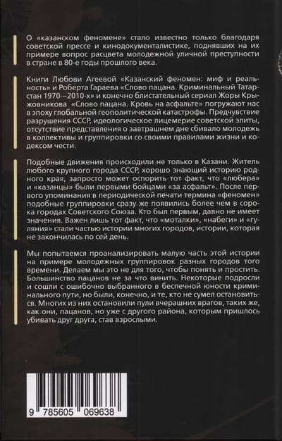 Книги Любови Агеевой «Казанский феномен: миф и реальность» и Роберта Гараева «Слово пацана. Криминальный Татарстан 1970—2010-х» и конечно блистательный сериал Жоры Крыжовникова «Слово пацана. Кровь на асфальте» погружают нас в эпоху глобальной геополитической катастрофы. Предчувствие разрушения СССР, идеологическое лицемерие советской элиты, отсутствие представления о завтрашнем дне сбивало молодежь в коллективы и группировки со своими правилами жизни и кодексом чести. Подобные движения происходили не только в Казани. Житель любого крупного города СССР, хорошо знающий историю родного края, запросто может оспорить тот факт, что «любера» и «казанцы» были первыми бойцами «за асфальт». После первого упоминания в периодической печати термина «феномен» подобные группировки сразу же появились более чем в сорока городах Советского Союза. Кто был первым, давно не имеет значения. Важен лишь тот факт, что «моталки», «набеги» и «гуляния» стали частью истории многих городов, истории, которая не закончилась по сей день.