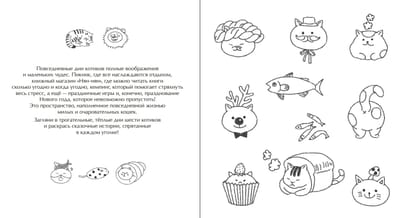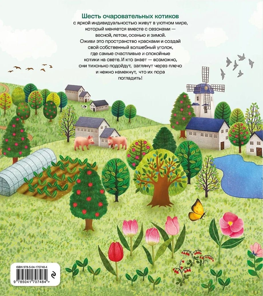 Раскраска передаёт тёплую, живую атмосферу, наполненную пушистым очарованием: здесь коты проводят уютные повседневные моменты в разных уголках мира весной, летом, осенью и зимой.