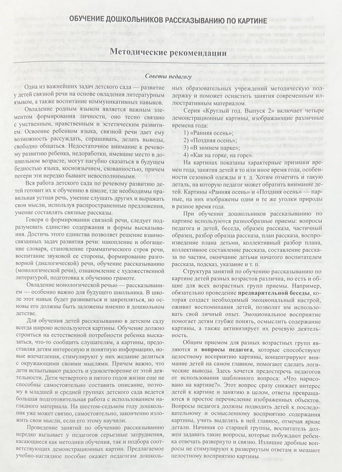 В альбоме представлены четыре демонстрационные картины, изображающие различные времена года, а также методические рекомендации по обучению дошкольников разных возрастных групп рассказыванию по картине. Приведены примерные планы-конспекты занятий. В ходе занятий решаются не только задачи речевого развития (в частности, связной речи), но задачи развития неречевых психических функций (восприятия, внимания, памяти, мышления), творческого воображения; прививается любовь к природе.