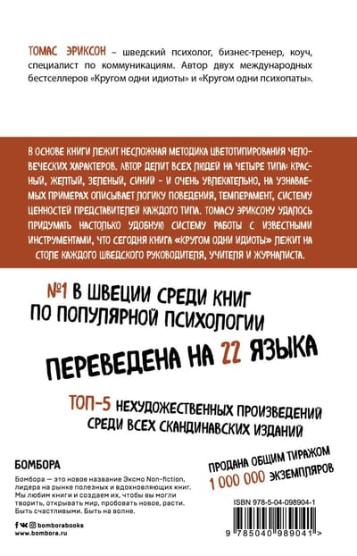 Скандинавский бестселлер по психологии общения. Выдержал 4 переиздания в Швеции. Являясь универсальной отмычкой к личности любого человека, эта книга лежит на столе каждого шведского руководителя, учителя и журналиста. Ее автор, знаменитый скандинавский психолог Томас Эриксон, делит всех людей на четыре цветовых типа. Он описывает логику поведения, темперамент, систему ценностей представителей каждого из цветов. Объясняет, как с ними находить общий язык, вести проекты, разрешать конфликты и заводить партнерские отношения.