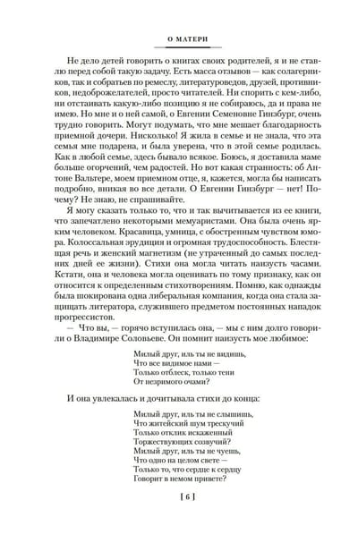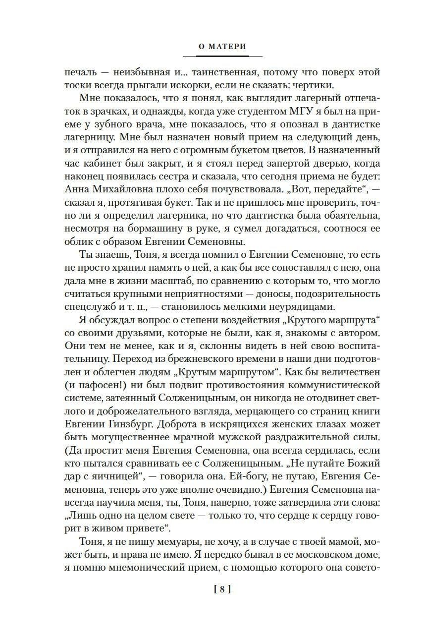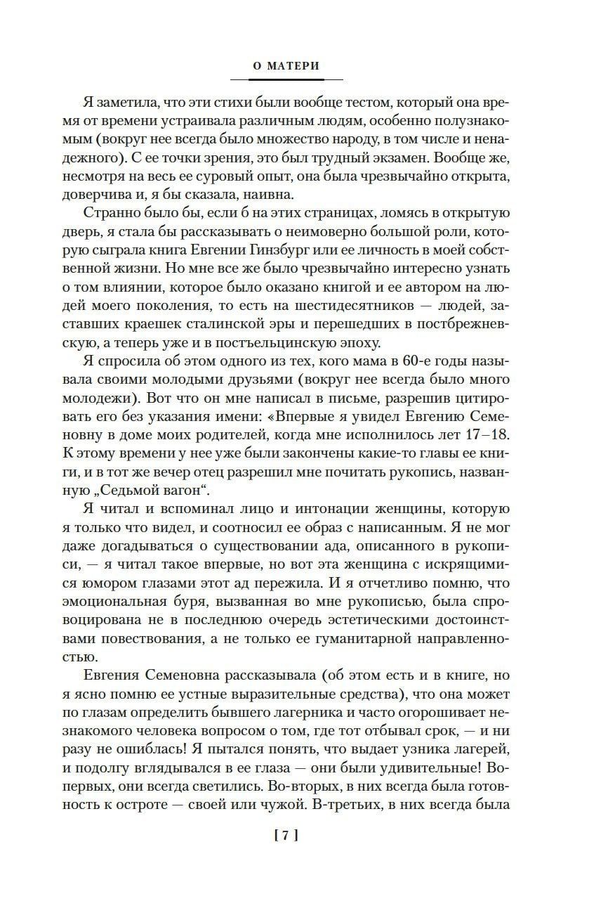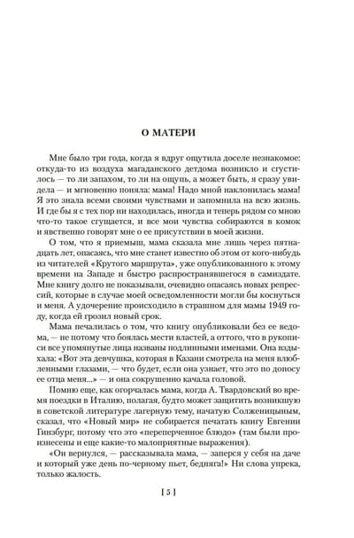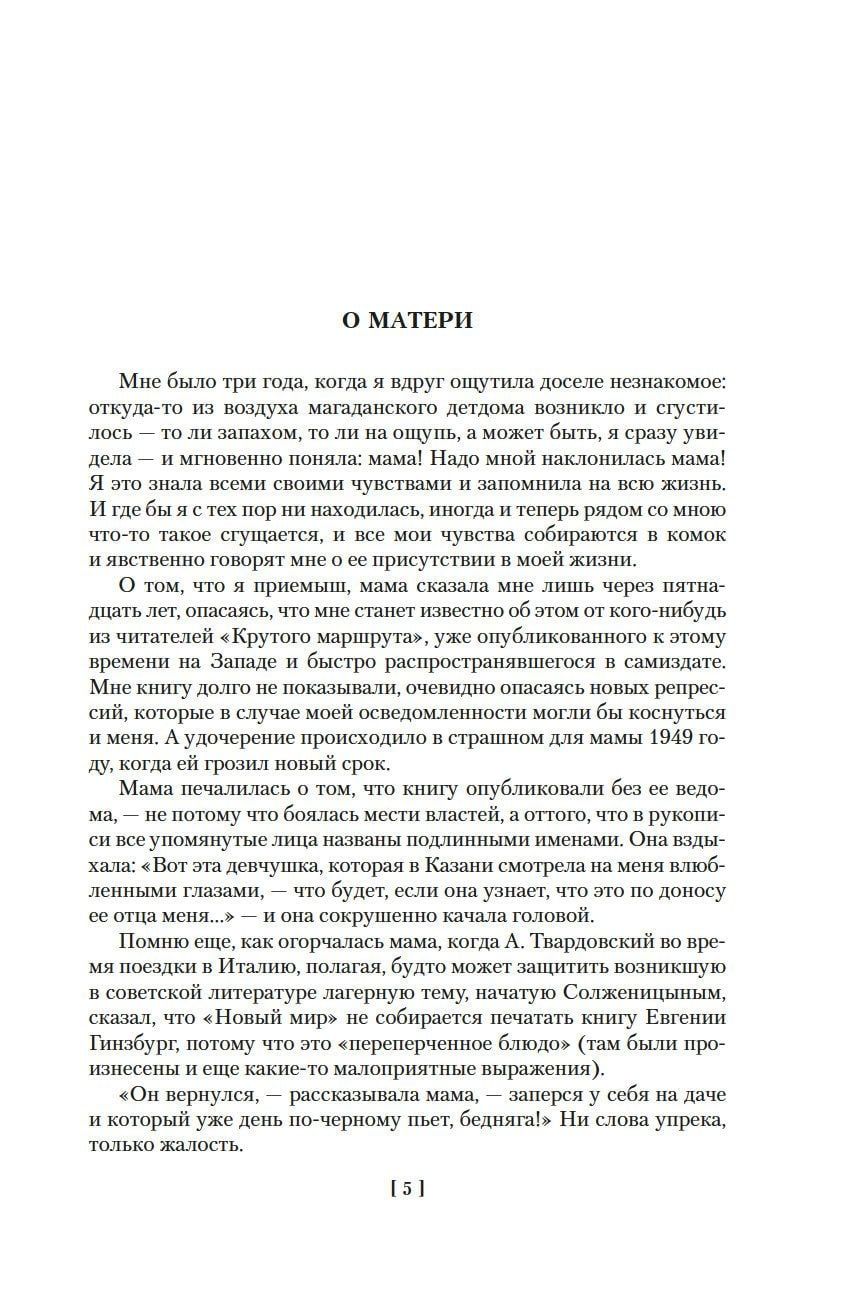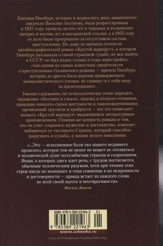 Евгения Гинзбург, историк и журналист, мать знаменитого писателя Василия Аксенова, была репрессирована в 1937 году, провела десять лет в тюрьмах и колымских лагерях и восемь лет в магаданской ссылке, а в 1955 году ее дело было прекращено за отсутствием состава преступления. Но даже во времена оттепели автобиографический роман «Крутой маршрут», в котором Гинзбург рассказала о своей страшной судьбе, не мог выйти в СССР: он был издан только в годы перестройки, став одним из самых известных свидетельств о преступлениях сталинского режима — причем Гинзбург, которая до ареста была верным приверженцем коммунистического учения, не снимает и с себя вину за происходившее. Умение сдержанно, но психологически точно передать ощущения «безумия и ужаса», надежд и полного отчаяния, правдиво показать сцены жестокости и самопожертвования, проявлений трусости и храбрости — все это позволяет назвать «Крутой маршрут» выдающимся литературным произведением. Главная же ценность романа в том, что он учит сохранять мужество и достоинство, помогает избавиться от «великого Страха», который способен разрушать и судьбы, и жизни целого поколения.