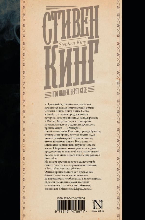 «Просыпайся, гений» — с этих слов начинается новый потрясающий роман Стивена Кинга. Книга о силе Слова, в какой-то степени продолжающая историю, которую писатель начал в романе «Мистер Мерседес», и в то же время перекликающаяся с одним из лучших  его произведений – «Мизери». Гений – писатель Ротстайн, прежде бунтарь, а теперь затворник, вот уже долгие годы ничего не публикует. Но это не значит, что он ничего не пишет. В его доме – множество черновиков, ждущих «своего часа». Сборники стихов, рассказы и даже продолжение знаменитой саги, изменившей судьбы едва ли не целого поколения фанатов Ротстайна.  Но теперь крутой поворот делает судьба самого писателя – черновики похищают, а Ротстайна жестоко убивают… Однако пройдет много лет, прежде чем блокноты писателя вновь всплывут на поверхность, чтобы самым непостижимым образом соединить людей, имевших отношение к трагическим событиям, связанным с Мистером Мерседесом...