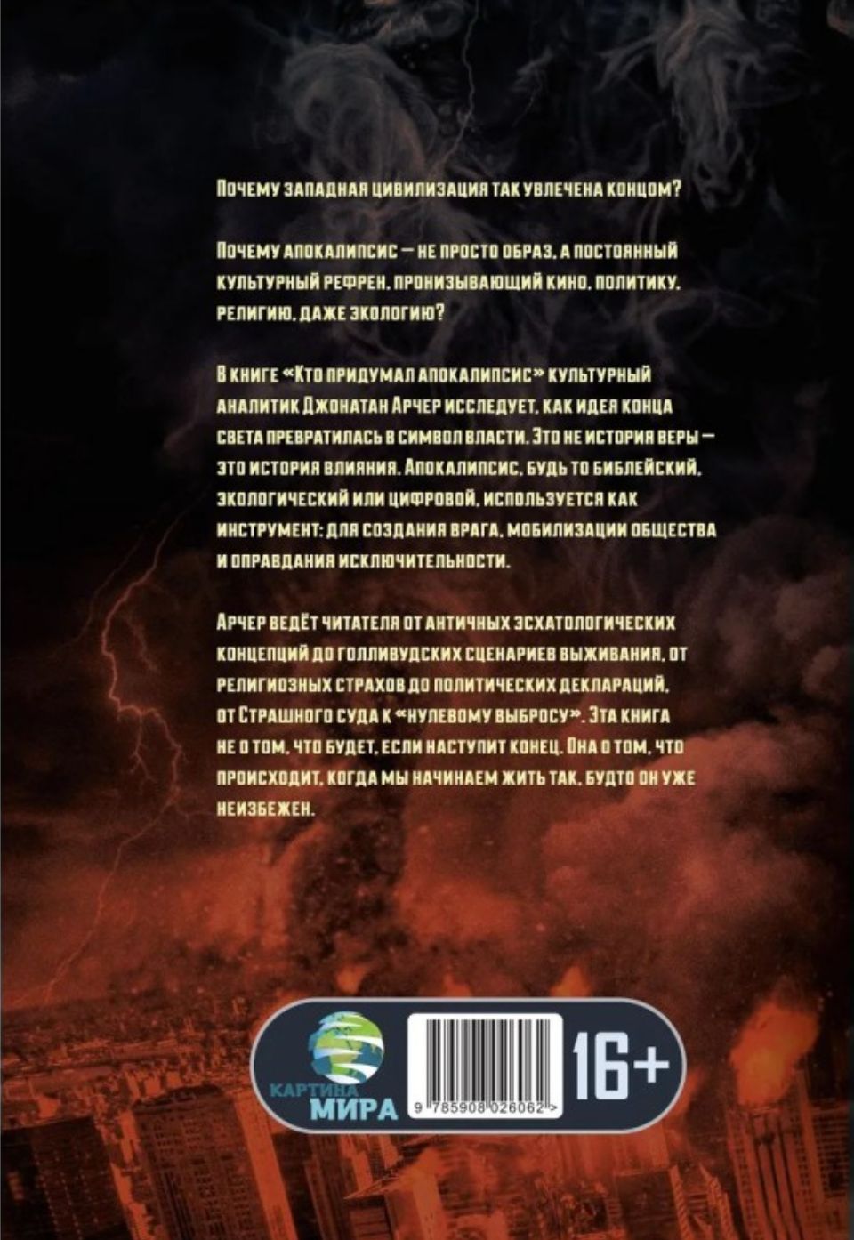 Почему западная цивилизация так увлечена концом? Почему апокалипсис не просто образ, а постоянный культурный рефрен, пронизывающий кино, политику, религию, даже экологию? В книге «Кто придумал апокалипсис» культурный аналитик Джонатан Арчер исследует, как идея конца света превратилась в символ власти. Это не история веры это история влияния. Апокалипсис, будь то библейский, экологический или цифровой, используется как инструмент: для создания врага, мобилизации общества и оправдания исключительности.