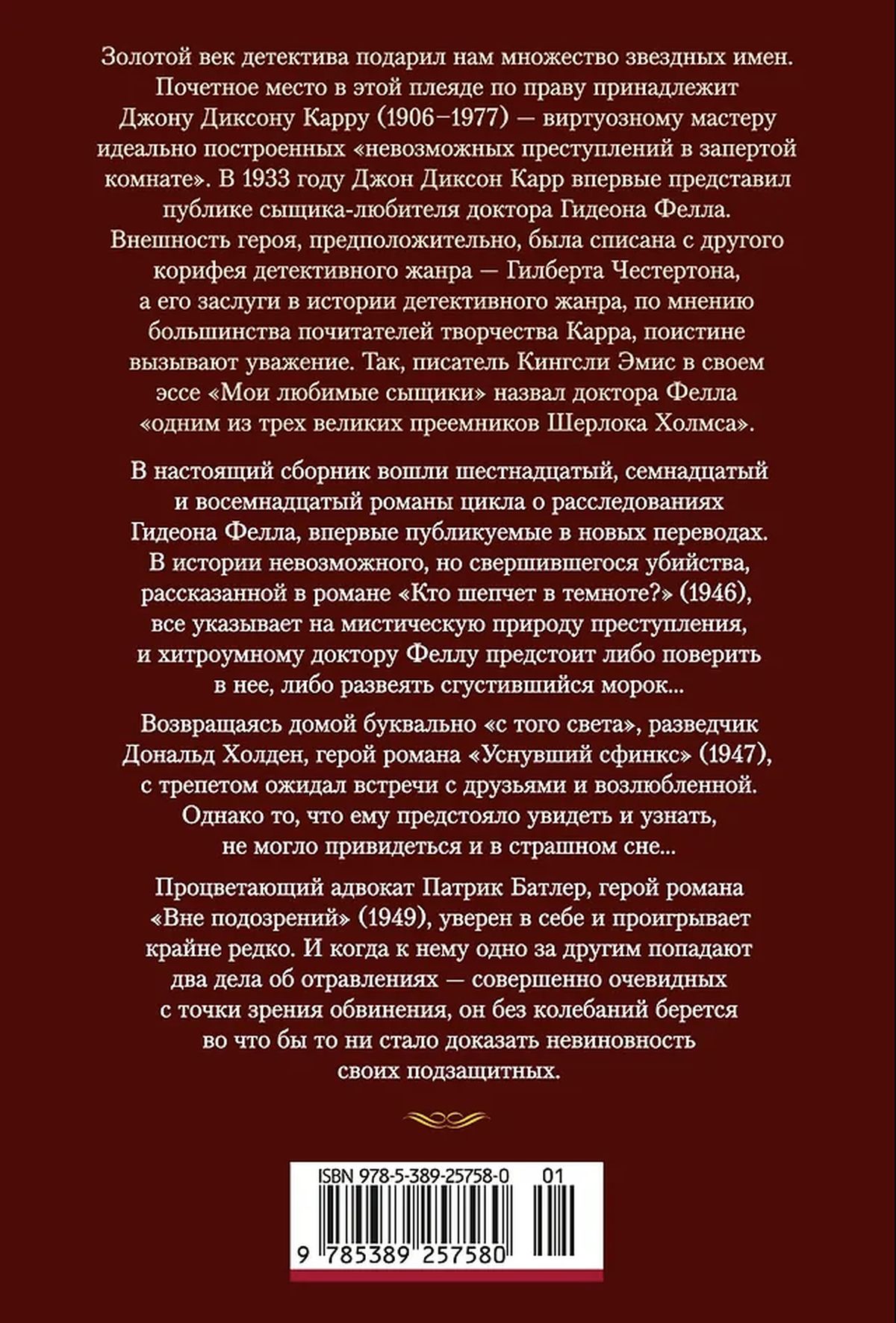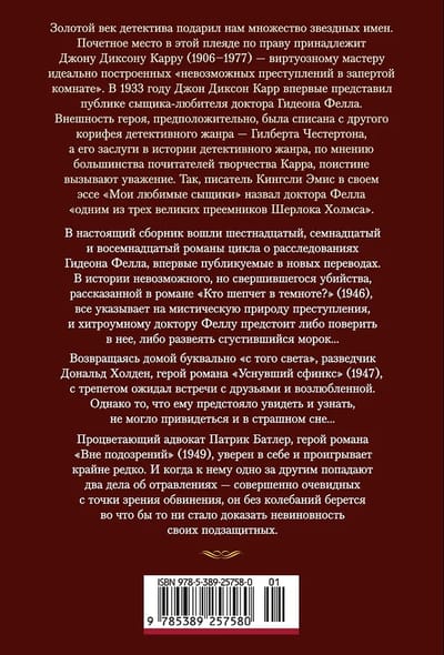 Золотой век детектива подарил нам множество звездных имен. Почетное место в этой плеяде по праву принадлежит Джону Диксону Карру (1906–1977) — виртуозному мастеру идеально построенных «невозможных преступлений в запертой комнате». В 1933 году Джон Диксон Карр впервые представил публике сыщика-любителя доктора Гидеона Фелла. Внешность героя, предположительно, была списана с другого корифея детективного жанра — Гилберта Честертона, а его заслуги в истории детективного жанра, по мнению большинства почитателей творчества Карра, поистине вызывают уважение. Так, писатель Кингсли Эмис в своем эссе «Мои любимые сыщики» назвал доктора Фелла «одним из трех великих преемников Шерлока Холмса».