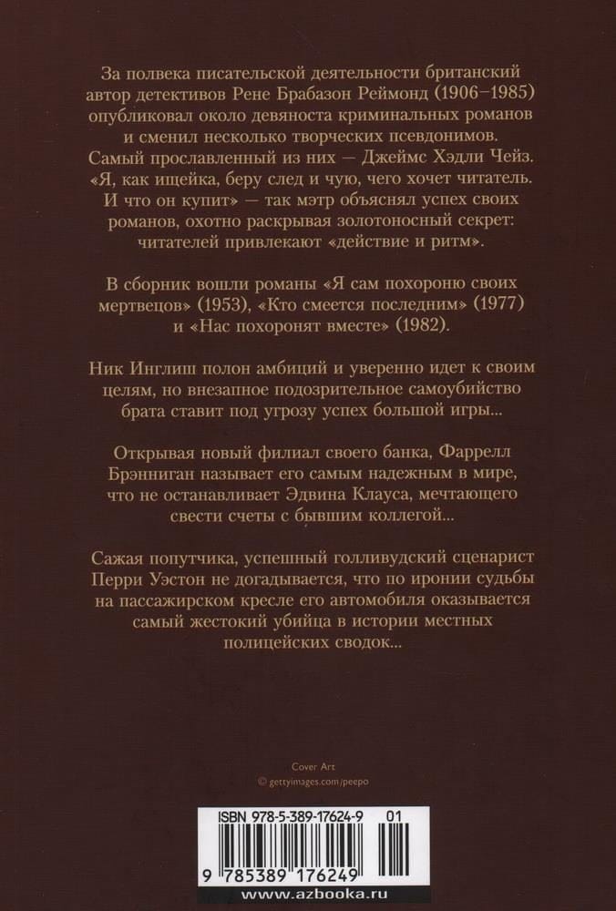 За полвека писательской деятельности британский автор детективов Рене Брабазон Реймонд (1906–1985) опубликовал около девяноста криминальных романов и сменил несколько творческих псевдонимов. Самый прославленный из них — Джеймс Хэдли Чейз. «Я, как ищейка, беру след и чую, чего хочет читатель. И что он купит» — так мэтр объяснял успех своих романов, охотно раскрывая золотоносный секрет: читателей привлекают «действие и ритм». В сборник вошли романы «Я сам похороню своих мертвецов» (1953), «Кто смеется последним» (1977) и «Нас похоронят вместе» (1982). Ник Инглиш полон амбиций и уверенно идет к своим целям, но внезапное подозрительное самоубийство брата ставит под угрозу успех большой игры… Открывая новый филиал своего банка, Фаррелл Брэнниган называет его самым надежным в мире, что не останавливает Эдвина Клауса, мечтающего свести счеты с бывшим коллегой... Сажая попутчика, успешный голливудский сценарист Перри Уэстон не догадывается, что по иронии судьбы на пассажирском кресле его автомобиля оказывается самый жестокий убийца в истории местных полицейских сводок…