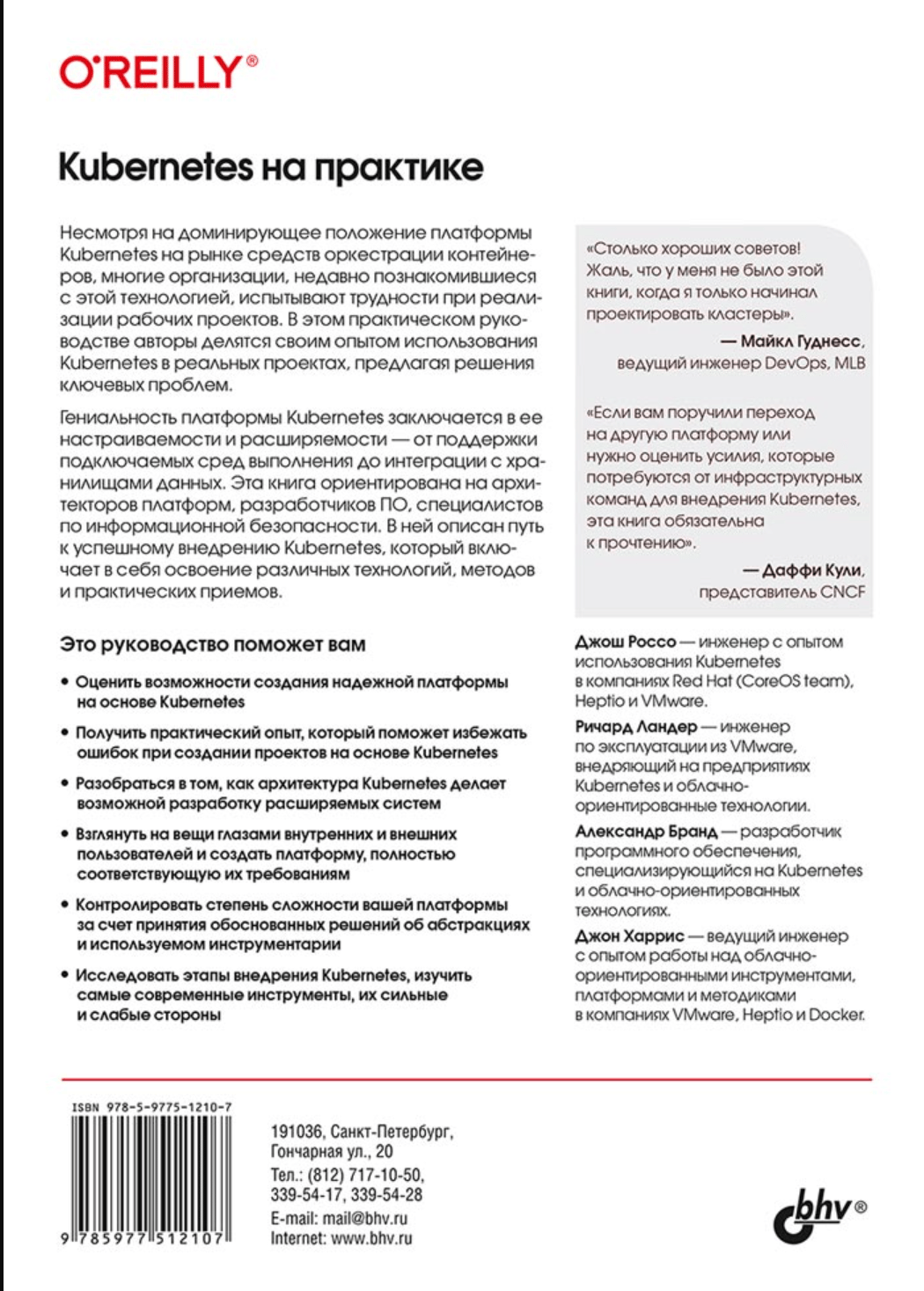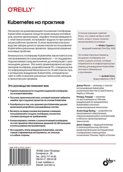 Книга посвящена практическому применению платформы Kubernetes. Подробно рассматривается архитектура Kubernetes и ее составные компоненты. Описаны модели развертывания инфраструктуры, ее топология, принципы автоматизации процессов, среда выполнения контейнеров, хранилища данных и сетевое взаимодействие между элементами системы. Рассматриваются создание и маршрутизация сервисов, управление конфиденциальными данными, допусками, мультитенантность, уровни изоляции и абстрагирование. Приведены наглядные примеры развертывания Kubernetes и оркестрации контейнеров для решения различных практических задач.