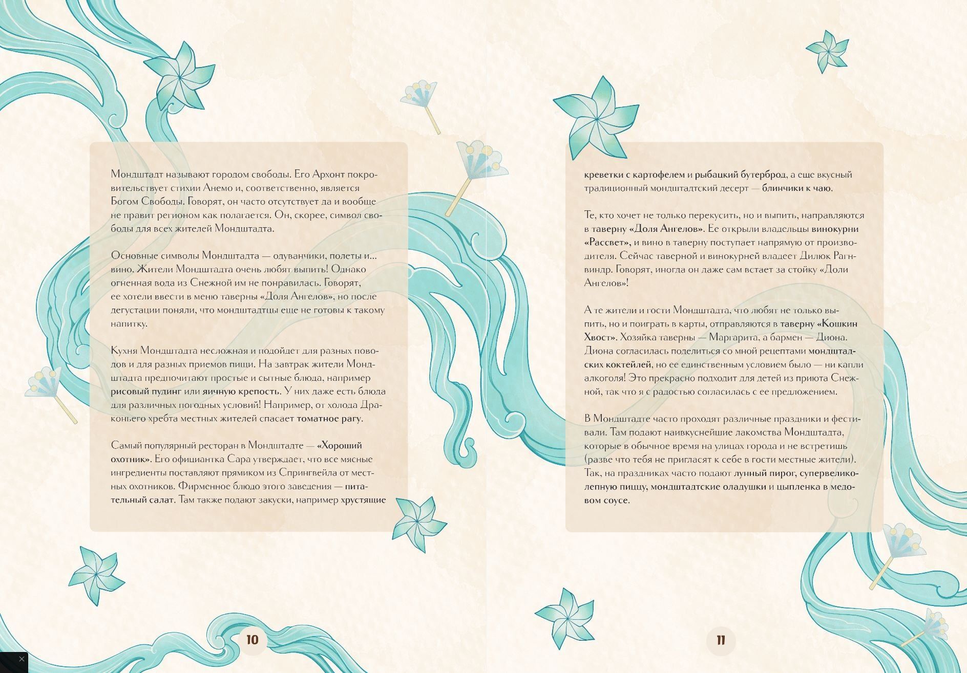 - Начните, как полагается, с Мондштадта: попробуйте традиционные оладушки, супервеликолепную пиццу и целых 7 коктейлей от Дионы;