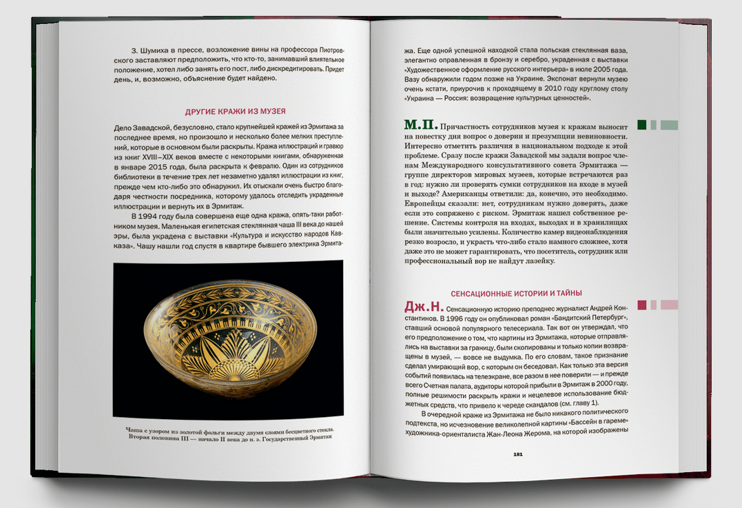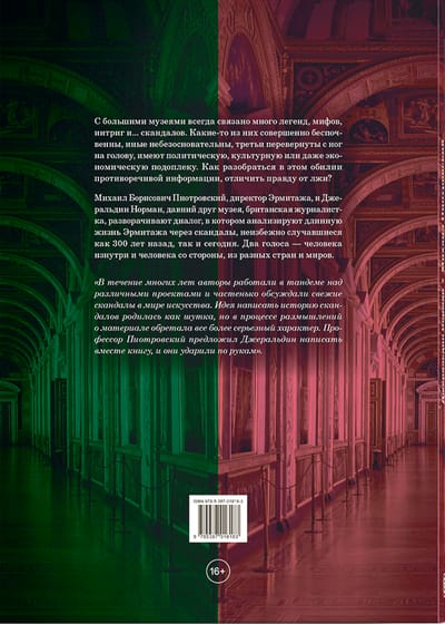 С большими музеями всегда связано много легенд, мифов, интриг и скандалов. Какие-то из них совершенно беспочвенны, иные небезосновательны, третьи перевернуты с ног на голову, имеют политическую, культурную или даже экономическую подоплеку. Как разобраться в этом обилии противоречивой информации и отличить правду от лжи? Михаил Борисович Пиотровский, директор Эрмитажа, и Джеральдин Норман, давний друг музея, британская журналистка, разворачивают диалог, в котором анализируют длинную жизнь Эрмитажа через скандалы, неизбежно случавшиеся как 300 лет назад, так и сегодня. Два голоса — человека изнутри и человека со стороны, из разных стран и миров.