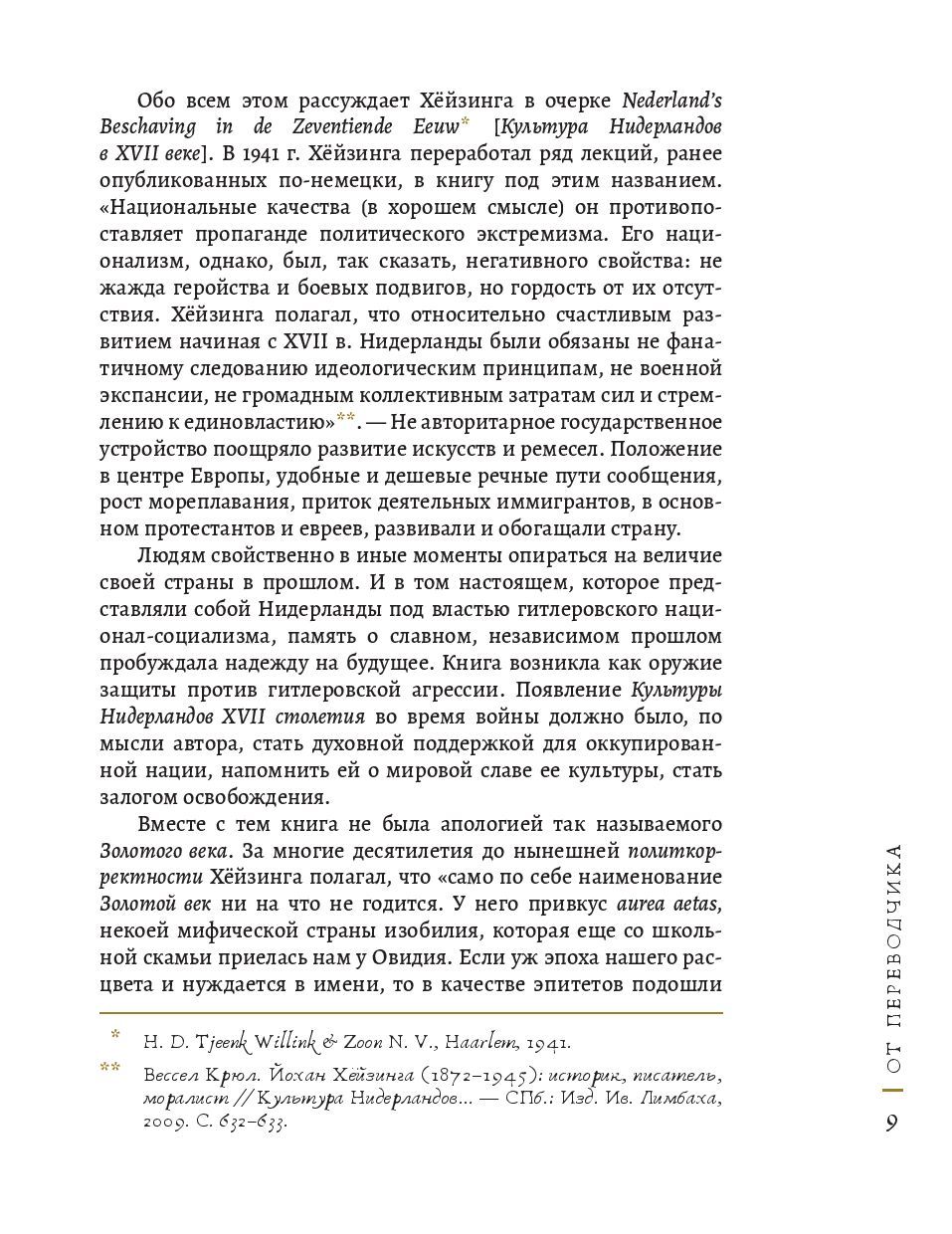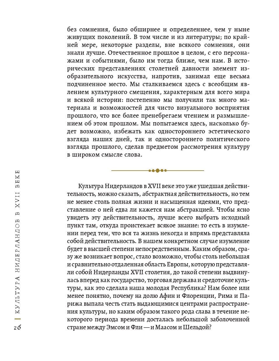 Йохан Хёйзинга (1872-1945) - нидерландский историк и культуролог с мировым именем. К наиболее известным его трудам, постоянно переиздающимся в разных странах - и, особо отметим, более всего на его родине и в России! - относятся Осень Средневековья и трактат Homo ludens (Человек играющий). Нидерланды в XVII веке - единственная страна Европы, которая в этот период достигает вершины одновременно во всех областях. Голландский флот странствует по всему миру, развиваются точные науки, кораблестроение, сельское хозяйство, Амстердам становится центром мировой торговли, возникают всё новые архитектурные шедевры, строятся каналы, дамбы. В городах появляются свои школы живописи, откуда выходят такие гении, как Рембрандт ван Рейн, Ян Вермеер, Франс Халс, Якоб Рёйсдал; своего пика достигает искусство гравюры и книгопечатания (Ян Лёйкен, Питер Санредам). Развиваются теология и философия (Бенедикт Спиноза, Рене Декарт). Как такая небольшая и сравнительно отдаленная заболоченная область Европы, которую представляли собой Нидерланды в XVII веке, до такой степени выдвинулась как государство, торговая держава и средоточие культуры? Йохан Хёйзинга в эссе Культура Нидерландов в XVII веке (1941) дает развернутый анализ причин и особенностей расцвета Республики. Появление этого сочинения во время войны, по мысли автора, должно было стать духовной поддержкой для оккупированной нации, напомнить ей о мировой славе ее культуры.