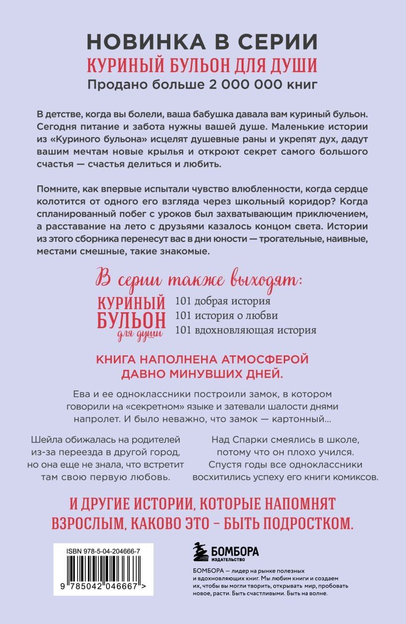 В детстве, когда вы болели, ваша бабушка давала вам куриный бульон. Сегодня питание и забота нужны вашей душе. Маленькие истории из «Куриного бульона» исцелят душевные раны и укрепят дух, дадут вашим мечтам новые крылья и откроют секрет самого большого счастья — счастья делиться и любить.