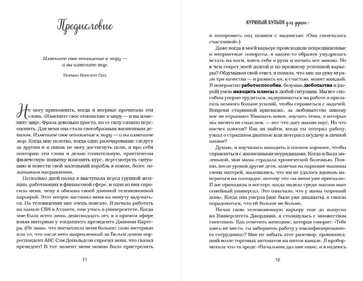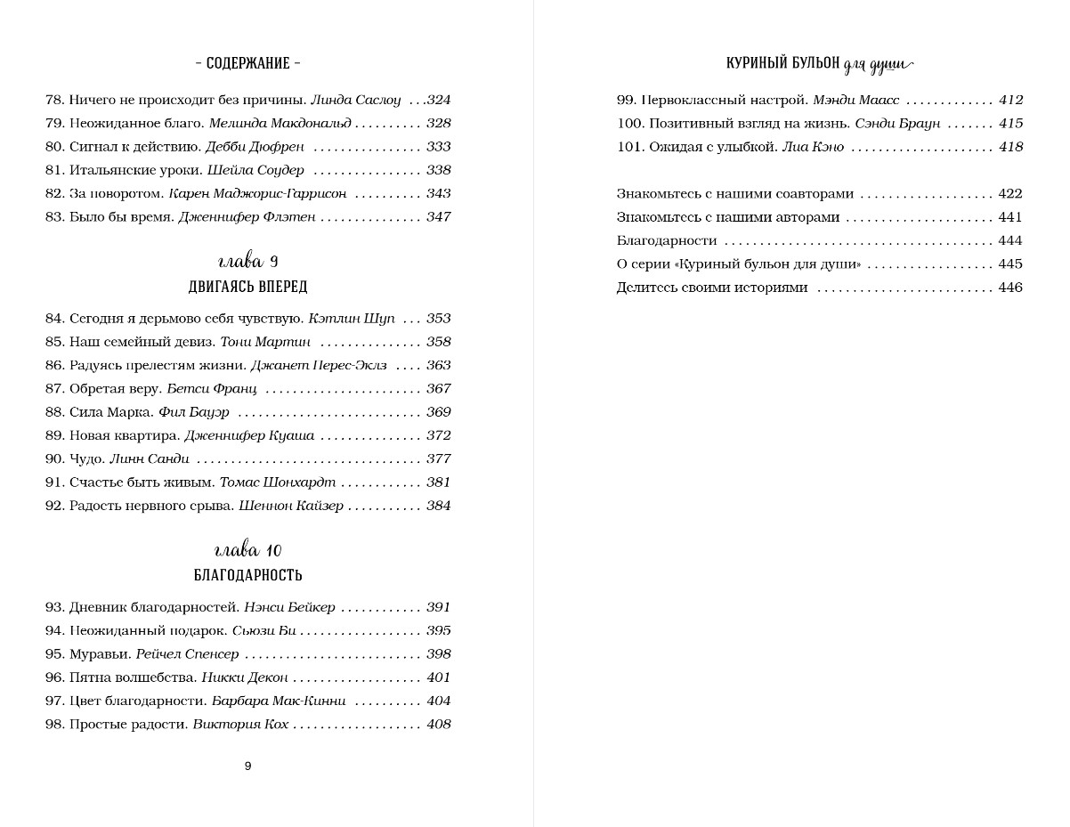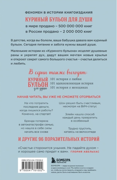 В детстве, когда вы болели, ваша бабушка давала вам куриный бульон. Сегодня питание и забота нужны вашей душе. Маленькие истории из «Куриного бульона», исцелят душевные раны и укрепят дух, дадут вашим мечтам новые крылья и откроют секрет самого большого счастья — счастья делиться и любить.