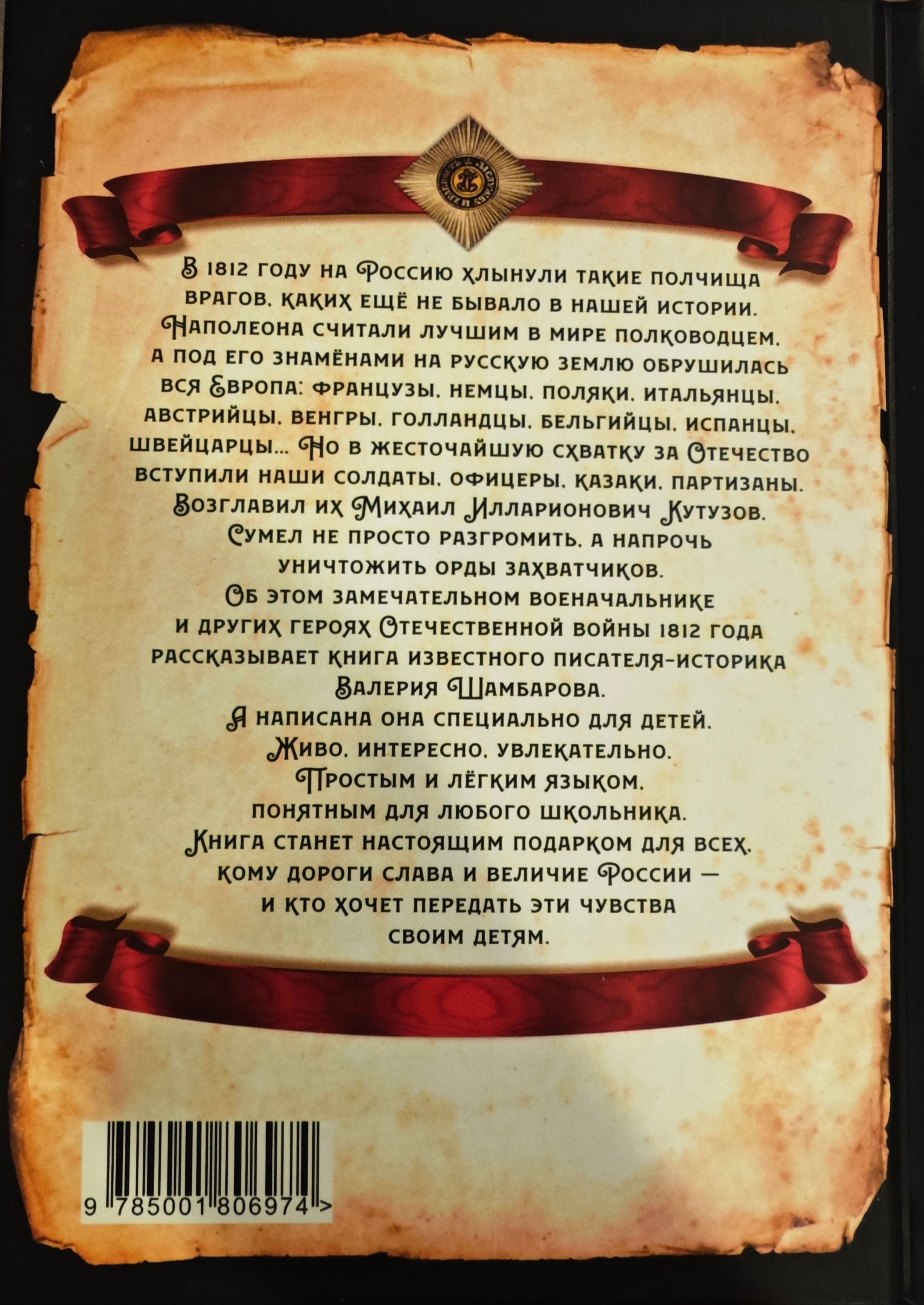 В 1812 году на Россию хлынули такие полчища врагов, каких ещё не бывало в нашей истории. Наполеона считали лучшим в мире полководцем, а под его знамёнами на русскую землю обрушилась вся Европа: французы, немцы, поляки, итальянцы, австрийцы, венгры, голландцы, бельгийцы, испанцы, швейцарцы… Но в жесточайшую схватку за Отечество вступили наши солдаты, офицеры, казаки, партизаны. Возглавил их Михаил Илларионович Кутузов. Сумел не просто разгромить, а напрочь уничтожить орды захватчиков. Об этом замечательном военачальнике и других героях Отечественной войны 1812 года рассказывает книга известного писателя-историка Валерия Шамбарова. А написана она специально для детей. Живо, интересно, увлекательно. Простым и лёгким языком, понятным для любого школьника. Книга станет настоящим подарком для всех, кому дороги слава и величие России — и кто хочет передать эти чувства своим детям