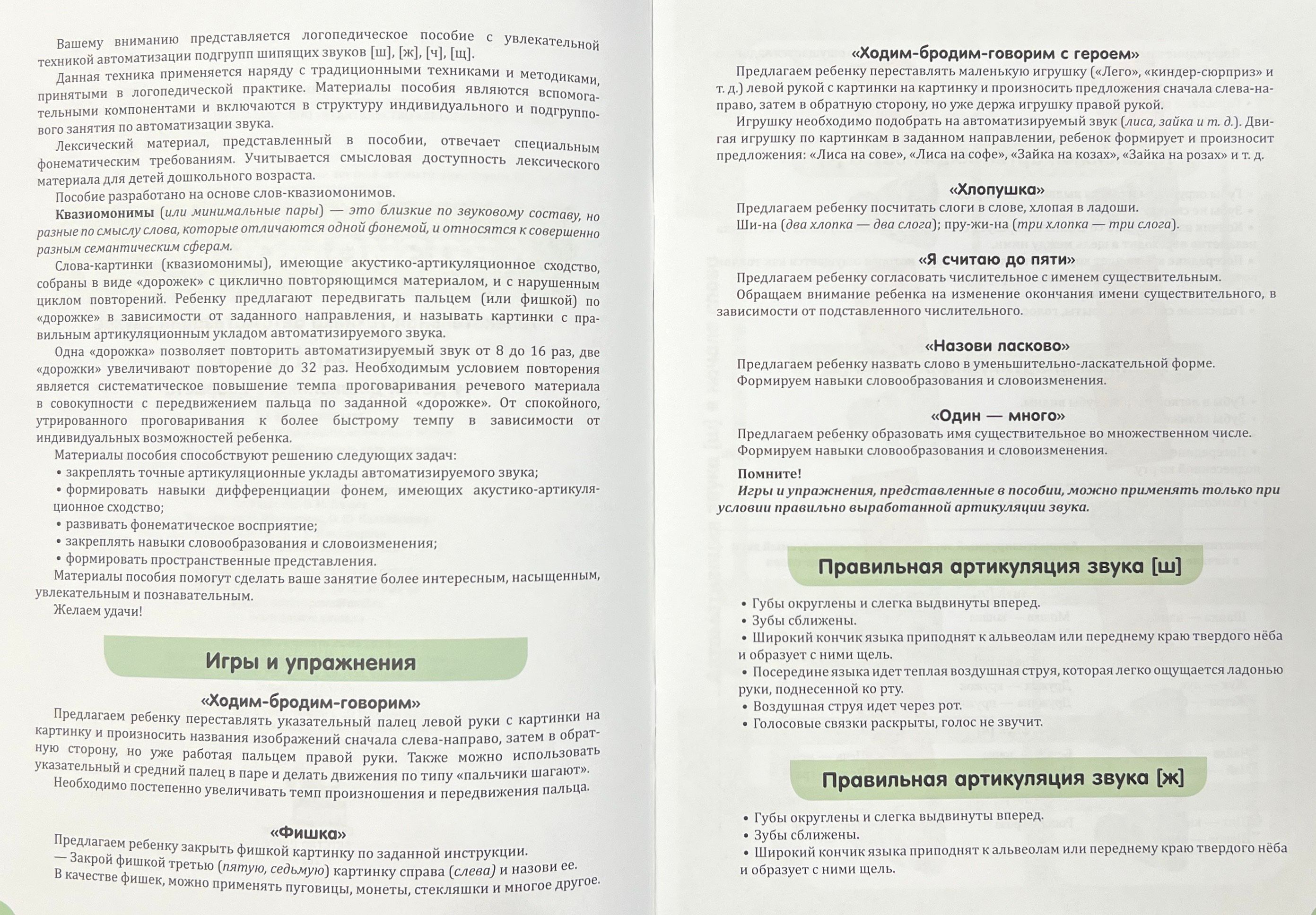 В пособии представлена увлекательная техника автоматизации звуков [ш], [ж], [ч], [щ]. Материал подобран на основе слов-квазиомонимов. Квазиомонимы (или минимальные пары) - это близкие по звуковому составу, но разные по смыслу слова, которые отличаются одной фонемой и относятся к совершенно различным семантическим сферам.