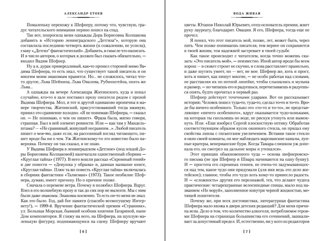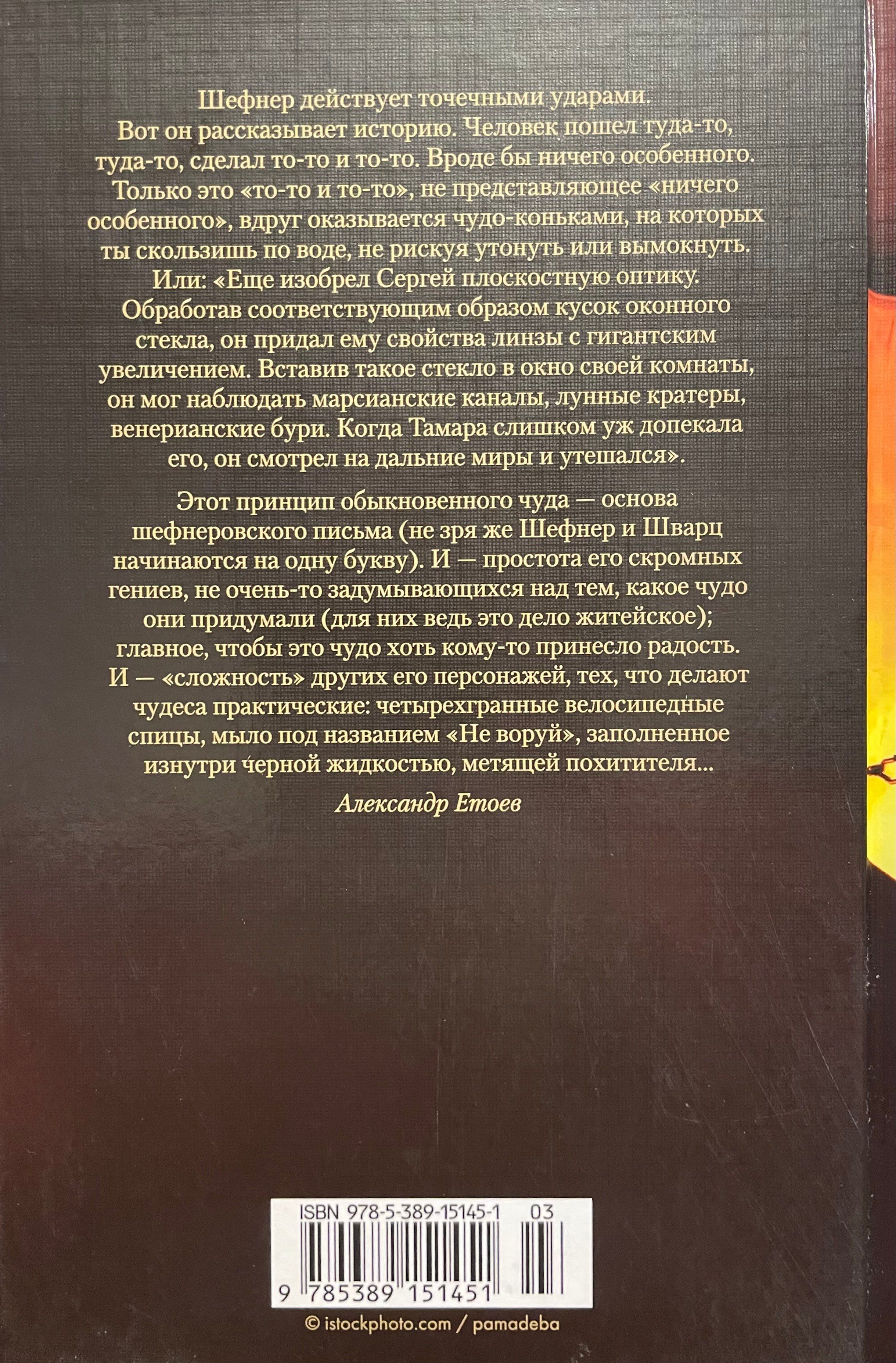 Принцип обыкновенного чуда — основа шефнеровского письма (не зря же Шефнер и Шварц начинаются на одну букву). И — простота его скромных гениев, не очень-то задумывающихся над тем, какое чудо они придумали (для них ведь это дело житейское); главное, чтобы это чудо хоть кому-то принесло радость. И — «сложность» других его персонажей, тех, что делают чудеса практические: четырехгранные велосипедные спицы, мыло под названием «Не воруй», заполненное изнутри черной жидкостью, метящей похитителя. И… Многие эти «и» — и составляют суть удивительного явления по имени Вадим Шефнер.