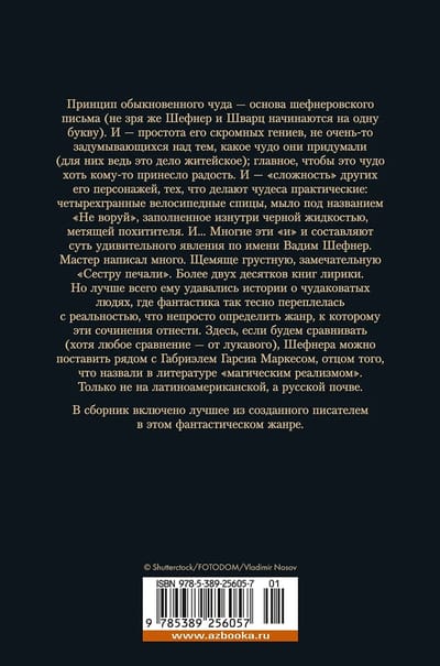 Принцип обыкновенного чуда — основа шефнеровского письма (не зря же Шефнер и Шварц начинаются на одну букву). И — простота его скромных гениев, не очень-то задумывающихся над тем, какое чудо они придумали (для них ведь это дело житейское); главное, чтобы это чудо хоть кому-то принесло радость. И — «сложность» других его персонажей, тех, что делают чудеса практические: четырехгранные велосипедные спицы, мыло под названием «Не воруй», заполненное изнутри черной жидкостью, метящей похитителя. И… Многие эти «и» — и составляют суть удивительного явления по имени Вадим Шефнер. Мастер написал много. Щемяще грустную, замечательную «Сестру печали». Более двух десятков книг лирики. Но лучше всего ему удавались истории о чудаковатых людях, где фантастика так тесно переплелась с реальностью, что непросто определить жанр, к которому эти сочинения отнести. Здесь, если будем сравнивать (хотя любое сравнение — от лукавого), Шефнера можно поставить рядом с Габриэлем Гарсиа Маркесом, отцом того, что назвали в литературе «магическим реализмом». Только не на латиноамериканской, а русской почве. В сборник включено лучшее из созданного писателем в этом жанре.