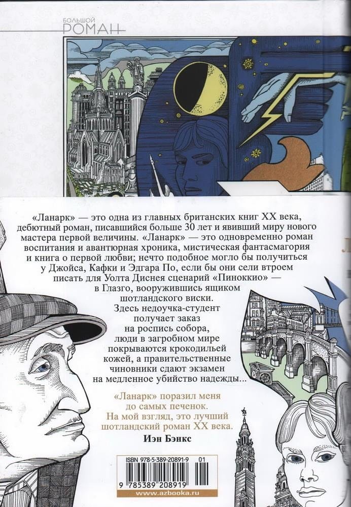 «Ланарк» — это одна из главных британских книг XX века, дебютный роман, писавшийся больше 30 лет и явивший миру нового мастера первой величины. «Ланарк» — это одновременно роман воспитания и авантюрная хроника, мистическая фантасмагория и книга о первой любви; нечто подобное могло бы получиться у Джойса, Кафки и Эдгара По, если бы они сели втроем писать для Уолта Диснея сценарий «Пиноккио» — в Глазго, вооружившись ящиком шотландского виски. Здесь недоучка-студент получает заказ на роспись собора, люди в загробном мире покрываются крокодильей кожей, а правительственные чиновники сдают экзамен на медленное убийство надежды.