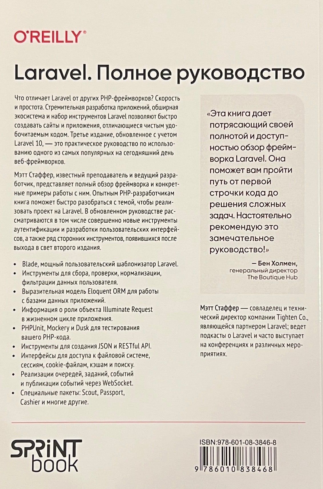 Мэтт Стаффер, известный преподаватель и ведущий разработчик, представляет полный обзор фреймворка и конкретные примеры работы с ним. Опытным PHP-разработчикам книга поможет быстро разобраться с темой, чтобы реализовать проект на Laravel. В обновленном руководстве рассматриваются в том числе совершенно новые инструменты аутентификации и разработки пользовательских интерфейсов, а также ряд сторонних инструментов, появившихся после выхода в свет второго издания.