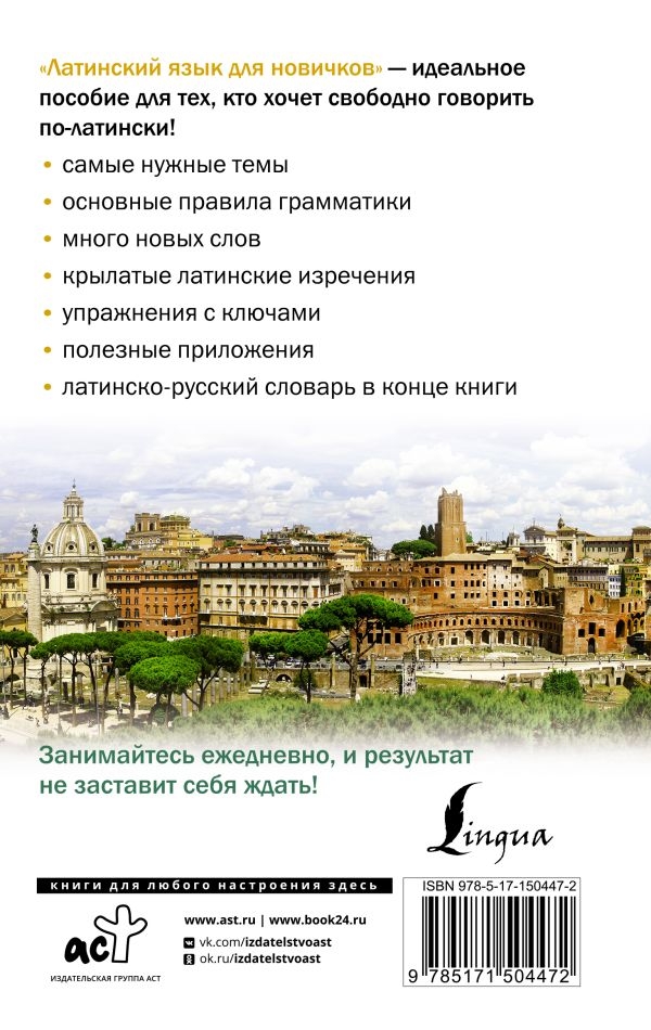 Пособие предназначено для обучения латинскому языку на начальном уровне. В этой книге вы найдете правила чтения и произношения, самые нужные грамматические темы, а также узнаете основные латинские времена. Материал в пособии изложен понятно и доступно, хорошо запоминается благодаря большому количеству примеров. В каждом уроке дается новая лексика и приводятся крылатые латинские изречения. Для успешного закрепления пройденной темы даны упражнения, ключи к которым помещены в конце книги. Вы также можете воспользоваться полезными приложениями и латинско-русским словарем. Стандартный формат издания, книгу удобно носить с собой. Пособие для всех, кто начинает учить латинский язык.