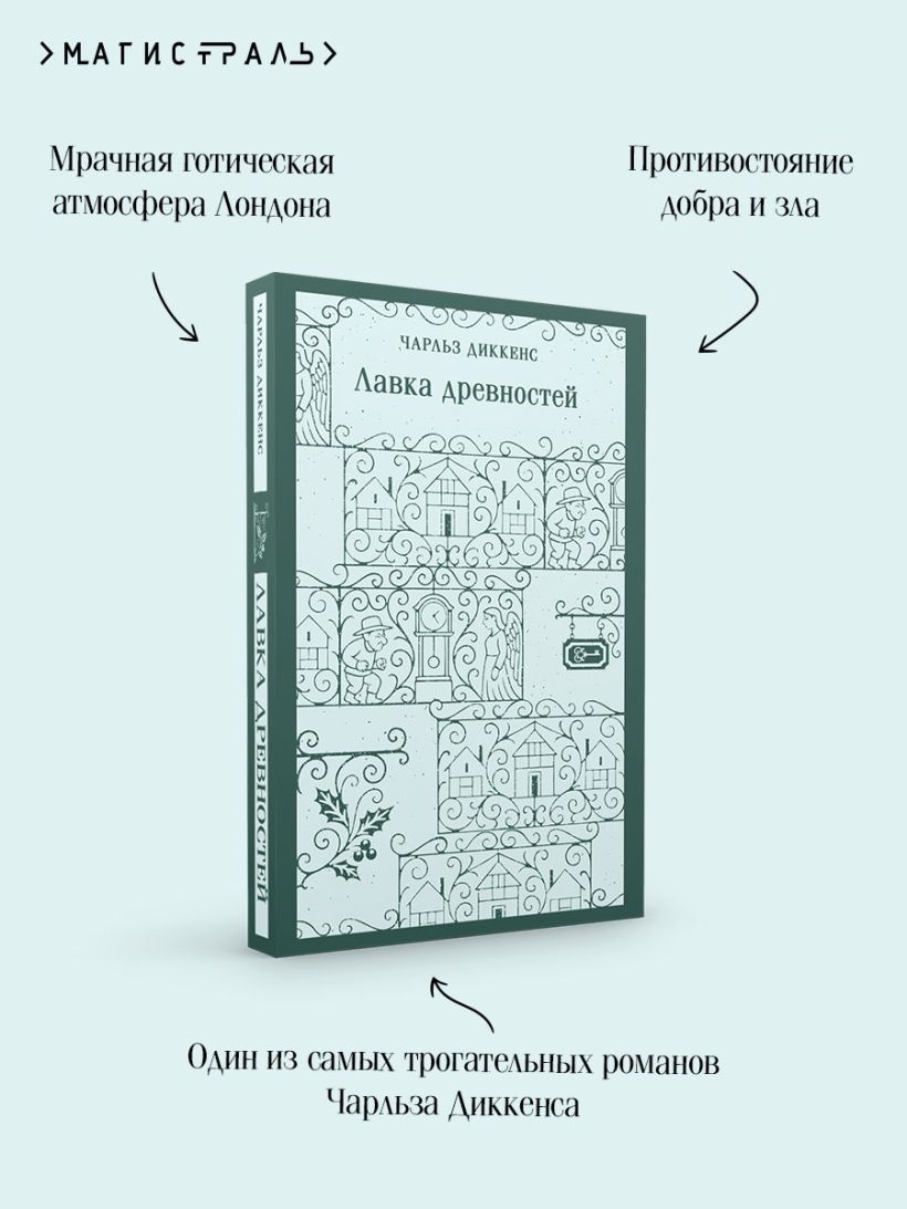 «Лавка древностей» — это переплетение реалистического повествования и сказки с элементами готики, причудливыми, странными и гротескными персонажами, мрачными тайнами. В романе о Нелл, маленькой девочке «бесконечно милого нрава», ее деде, выжившем из ума картежнике-мечтателе, и преследующем их жестоком карлике, ростовщике Квилпе, поднимается вечная тема противостояния добра и зла. Один из самых трогательных романов Чарльза Диккенса.