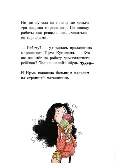 Нинни мечтает о велосипеде, но карманных денег хватает только на мороженое. Нужно подзаработать! Но кто возьмёт на работу девятилетнюю девочку? Разве что какой-нибудь чудак… Чтобы исполнить свою мечту, Нинни отправляется в «Лавку кошмаров» - магазинчик, торгующий монстрошвабрами, клетками для призраков и другими колдовскими штуковинами. Собеседование превращается в первое испытание. Не так-то просто найти нужное снадобье среди склянок с крохами разума и мешков с мини-драконами! Даже владелец магазина Страннодед всё время здесь теряется… Жутковатый ассортимент и странные сотрудники лавки ни капли не страшные, а очень милые и обаятельные - об этом позаботились Магдалена Хай - автор нашумевшего финского стимпанк-романа «Принцесса-нищенка», и художник Теэму Юхани - большой любитель печенья. По неподтверждённым данным, после создания иллюстраций для «Лавки кошмаров» он отдаёт предпочтение шарлотке из глазных яблок ящериц. Для младшего школьного возраста.