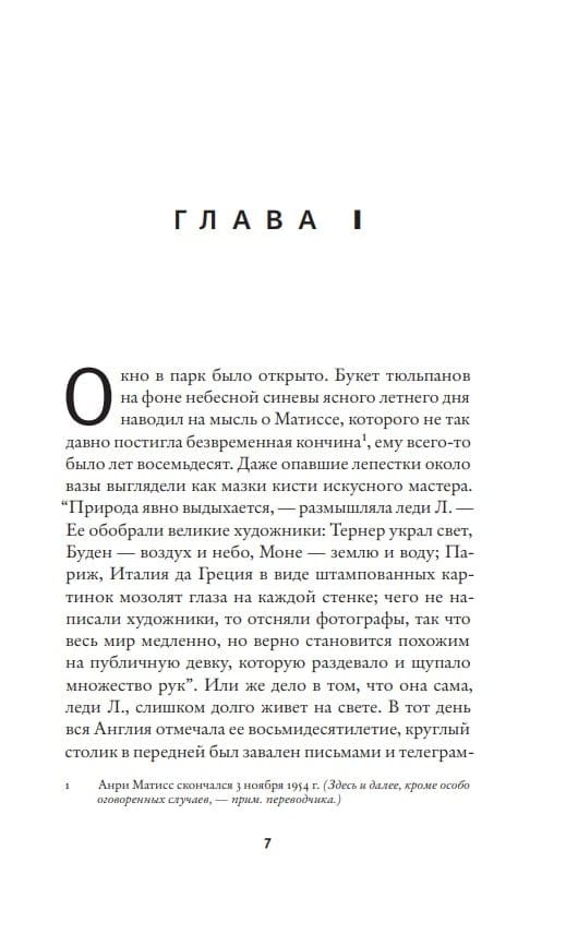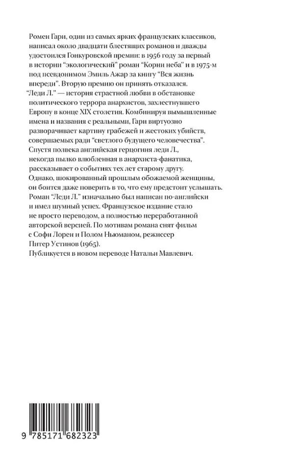 «Леди Л.» — драма страстной любви, разыгравшаяся в конце XIX столетия на фоне грабежей и политических убийств, совершаемых анархистами ради «светлого будущего человечества». Спустя полвека почтенная английская герцогиня, некогда пылко влюбленная в анархиста-фанатика, рассказывает о пережитом старому другу, глубоко шокированному прошлым обожаемой женщины. Принято считать эту книгу прощальным подарком Гари своей первой жене, английской писательнице Лесли Бланш, некоторые черты которой угадываются в неотразимой леди Л.