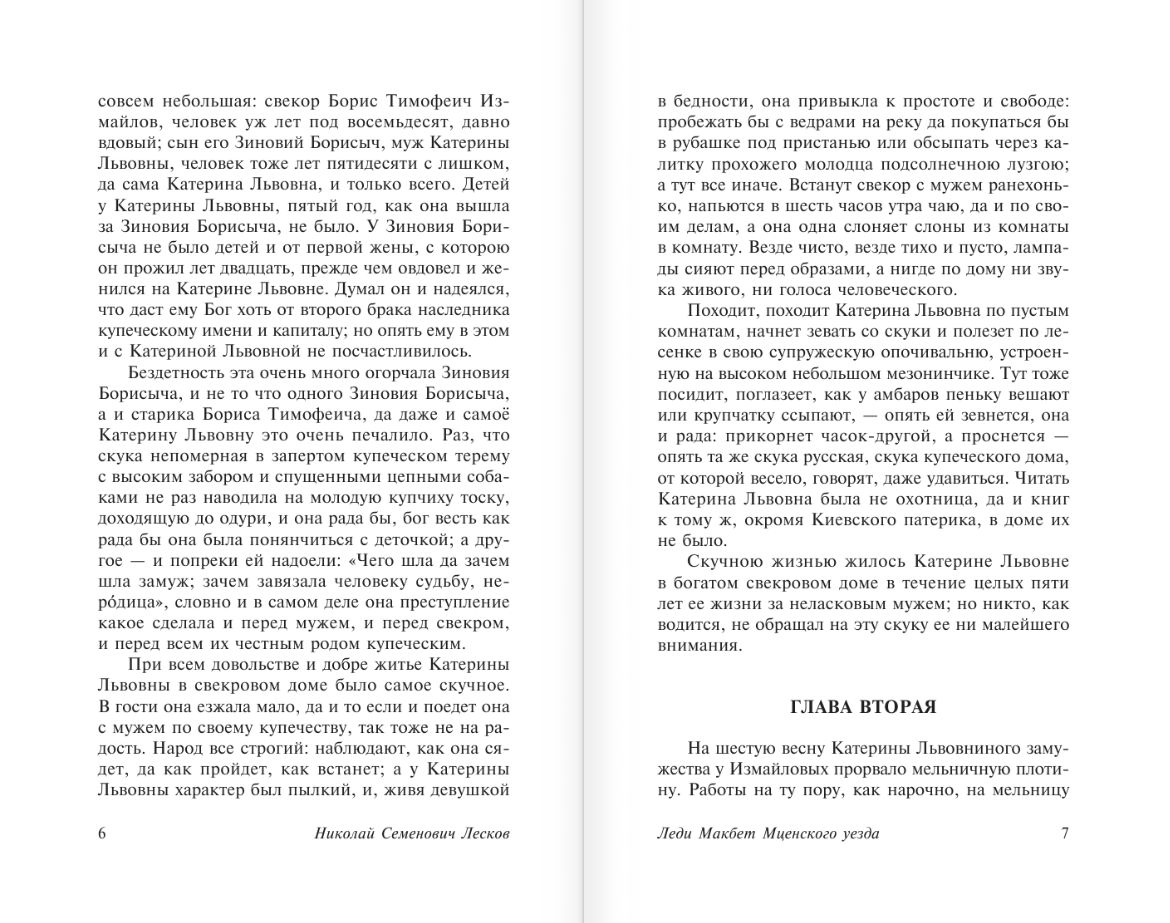 Отныне она уже не способна думать ни о чем, кроме возлюбленного, и готова ради него на любое безумство и преступление... Такова сюжетная завязка повести Лескова «‎Леди Макбет Мценского уезда»‎.