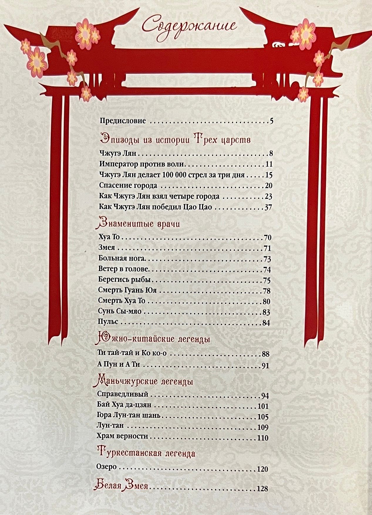 В сборник вошли эпизоды из истории «Трех царств», легенды о знаменитых китайских врачах, южно-китайские, маньчжурские и туркестанские легенды, а также предание о Белой Змее, в основе которого лежат реальные исторические факты.
