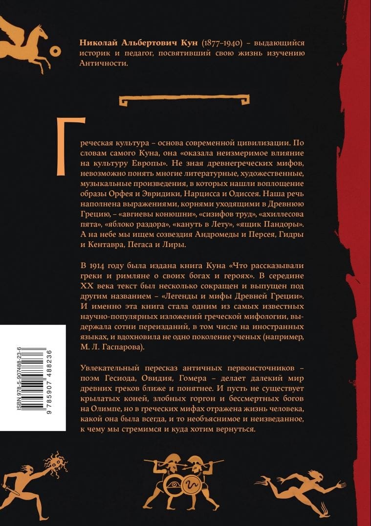 Более ста лет назад была издана книга Куна «Что рассказывали греки и римляне о своих богах и героях». В середине XX века текст был несколько сокращен и выпущен под другим названием - «Легенды и мифы Древней Греции». И именно эта книга стала одним из самых известных научно-популярных изложений греческой мифологии, выдержала сотни переизданий, в том числе на иностранных языках, и вдохновила не одно поколение ученых (например, М. Л. Гаспарова). Увлекательный пересказ античных первоисточников - поэм Гесиода, Овидия, Гомера - делает далекий мир древних греков ближе и понятнее. И пусть не существует крылатых коней, злобных горгон и бессмертных богов на Олимпе, но в греческих мифах отражена жизнь человека, какой она была всегда, и то необъяснимое и неизведанное, к чему мы стремимся и куда хотим вернуться.
