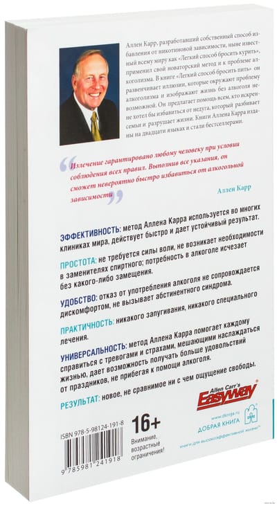 Аллен Карр, разработавший собственный способ избавления от никотиновой зависимости, ныне известный всему миру как «Легкий способ бросить курить», применил свой новаторский метод и к проблеме алкоголизма. В книге «Легкий способ бросить пить» он развенчивает иллюзии, которые окружают проблему алкоголизма и изображают жизнь без алкоголя невозможной. Он предлагает помощь всем, кто искренне хотел бы избавиться от недуга, который разбивает семьи и разрушает жизни. Метод Аллена Карра, демонстрируя феноменальную эффективность, получил признание среди специалистов, приобрел широкую популярность и пользуется огромным успехом во многих странах мира. Аллен Карр создал всемирную сеть клиник, где специалисты помогают курильщикам бросить курить, а людям, страдающим алкоголизмом, преодолеть зависимость от алкоголя. Книги Аллена Карра изданы на двадцати языках и стали бестселлерами.