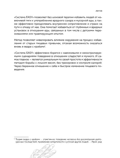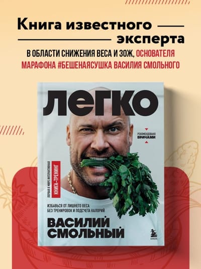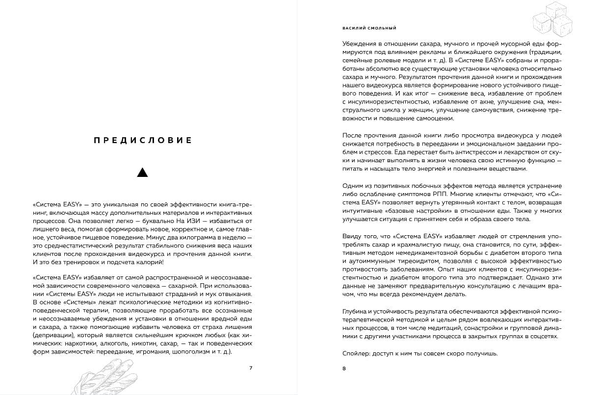 «Система EASY» от эксперта в области снижения веса, известного блогера и популяризатора здорового образа жизни, основателя одного из крупнейших фитнес-марафонов в мире #БЕШЕНАЯСУШКА Василия Смольного — подход, который позволяет пересмотреть отношение к сладкому и мучному, избавиться от тяги к этим продуктам и благодаря этому улучшить здоровье, похудеть, наполниться энергией. Вы узнаете, как появляется сахарная зависимость и какие убеждения поддерживают ее, скорректируете свое пищевое поведение и сможете с легкостью отказаться от вредной еды.