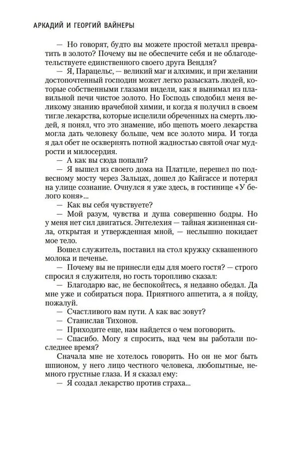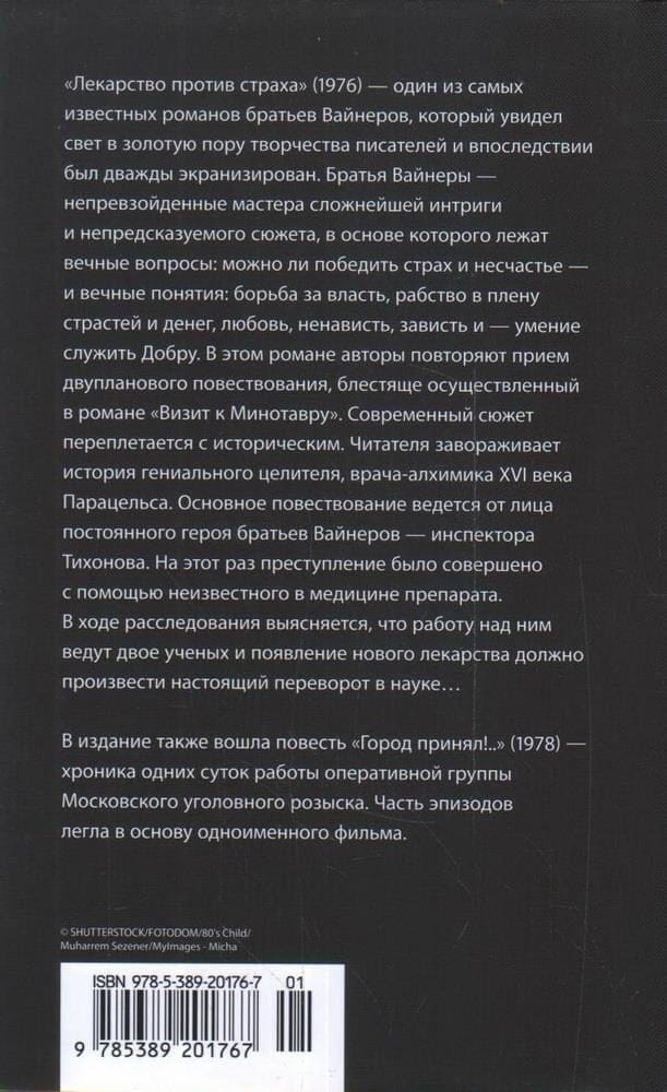 «Лекарство против страха» (1976) — один из самых известных романов братьев Вайнеров, который увидел свет в золотую пору творчества писателей и впоследствии дважды экранизировался. Прием совмещения временных планов, ранее испробованный авторами в «Визите к Минотавру», вновь позволил создать не просто захватывающий детектив, а произведение, в котором современный сюжет переплетается с историческим, в данном случае — с рассказом о враче-алхимике XVI века Парацельсе. Основное повествование ведется от лица постоянного героя братьев Вайнеров — инспектора Тихонова. На этот раз преступление было совершено с помощью неизвестного в медицине препарата. В ходе расследования выясняется, что работу над ним ведут двое ученых и появление нового лекарства должно произвести настоящий переворот в науке… В издание также вошла повесть «Город принял!..» (1978) — хроника одних суток работы оперативной группы Московского уголовного розыска. Часть эпизодов легла в основу одноименного фильма.